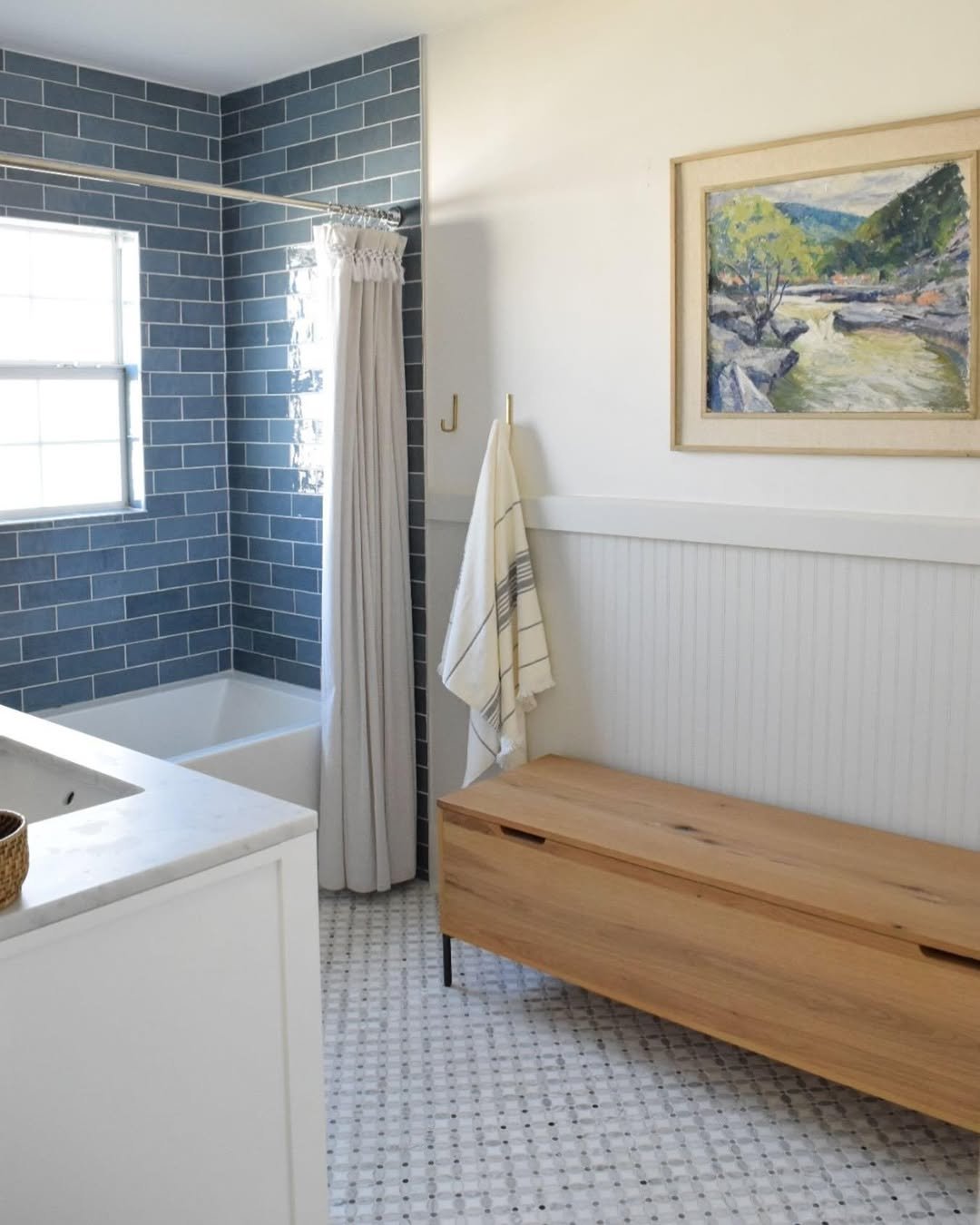 This is your “real life but make it pretty” bathroom. The soft blue tiles bring in color without overwhelming the space, while the clean white elements keep it light and easy.
