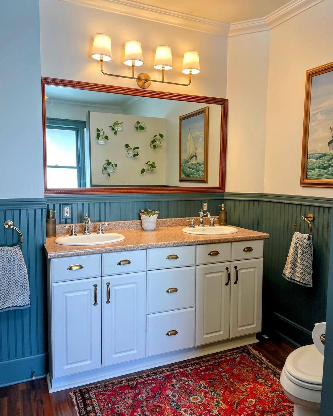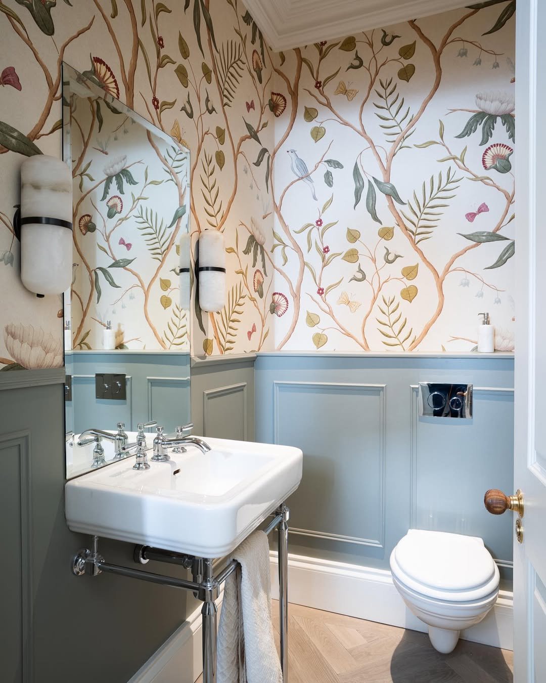 This one instantly wakes you up—in the best way. That deep blue paneling paired with the leafy wallpaper creates this layered, almost tropical feel, but it’s still polished and put-together. The cane mirror detail softens everything just enough so it doesn’t feel too graphic.