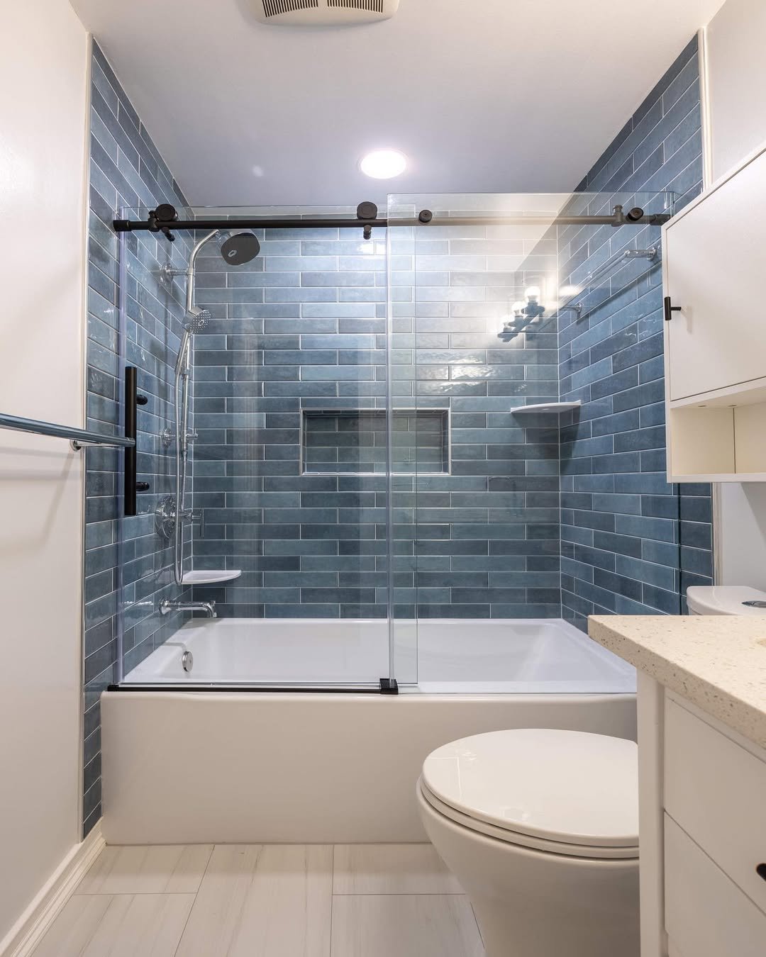 This is the kind of bathroom that just works. The blue subway tiles bring in color without overpowering the space, while the clean white fixtures keep everything fresh and balanced.