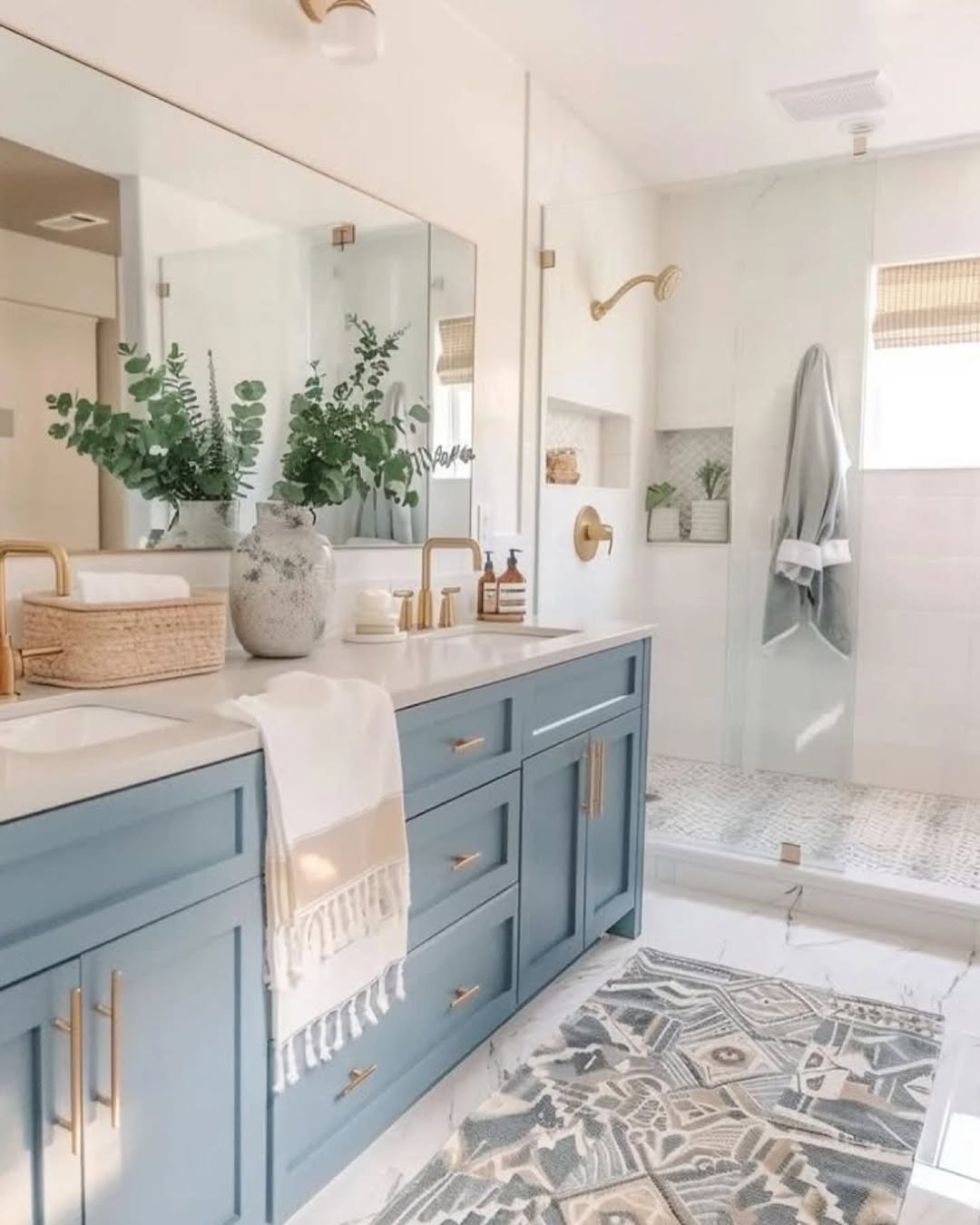 This one leans into that breezy, everyday luxury. The dusty blue vanity paired with warm brass hardware feels fresh but timeless, like something you won’t get tired of anytime soon.