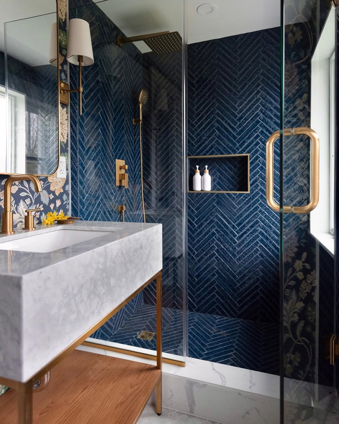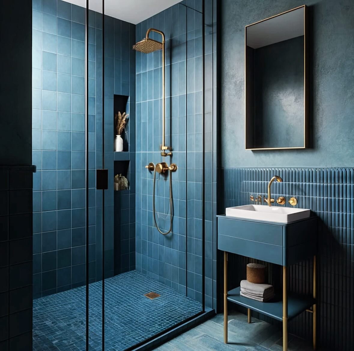 This one leans darker, moodier, and a little more refined. The layered blues—from the tiles to the walls—create depth without feeling heavy, and the gold accents just elevate everything instantly.