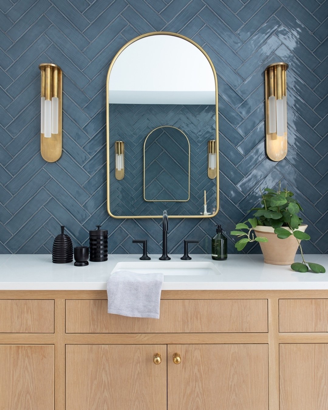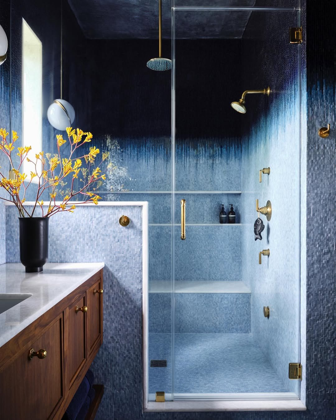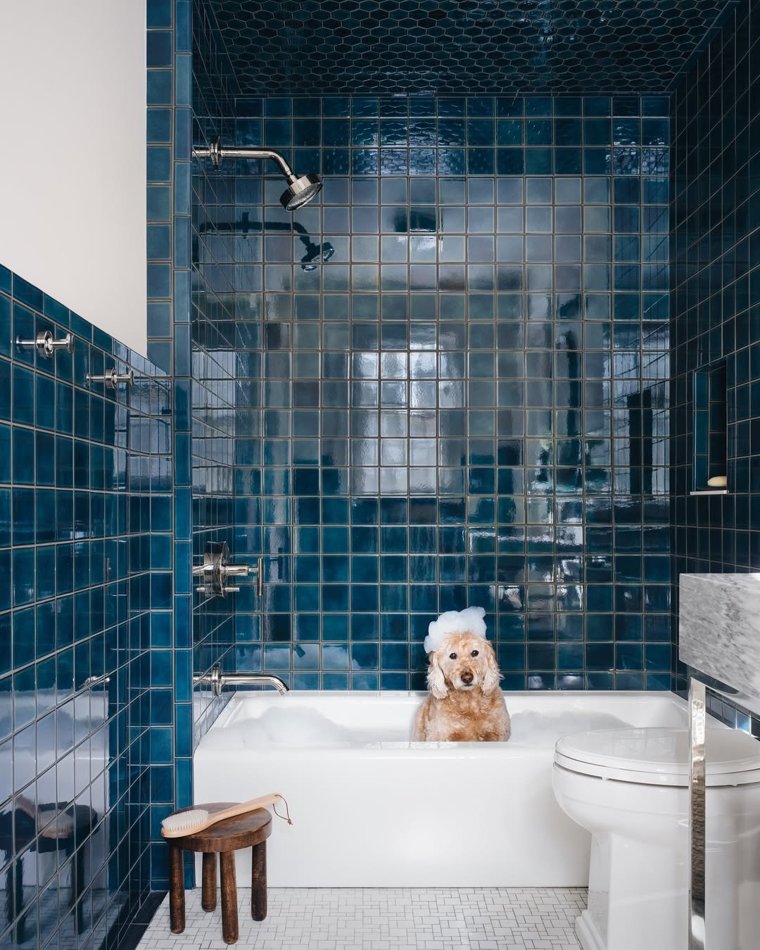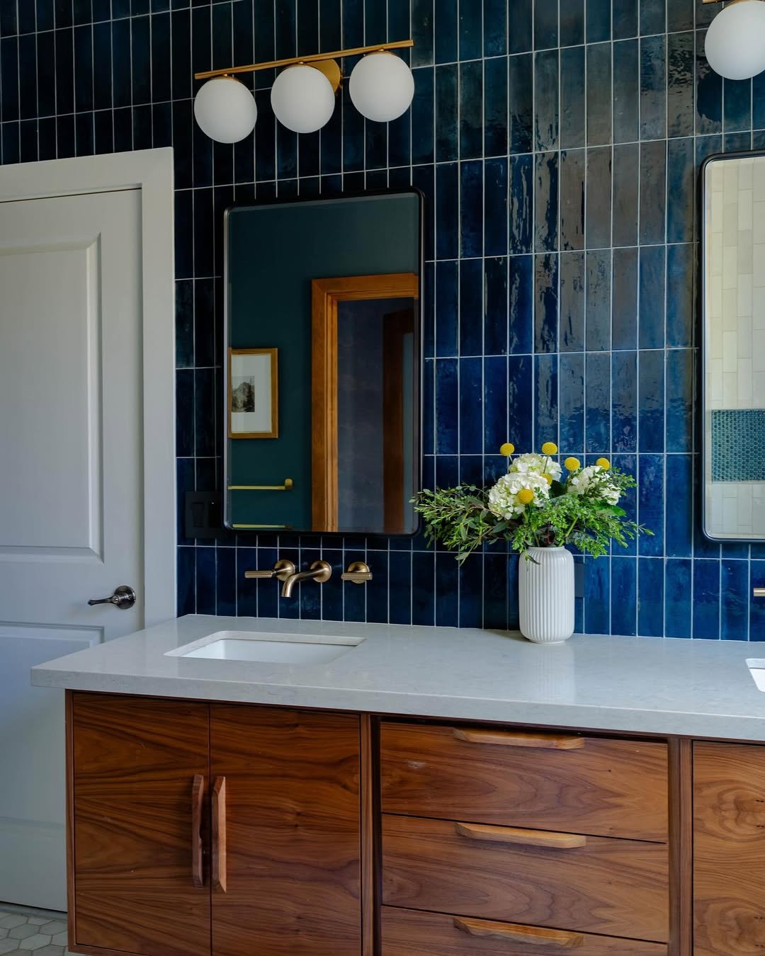 And then there’s this—bold, glossy, and a little unexpected. The rich blue tiles bounce light around in such a satisfying way, making the whole space feel alive.