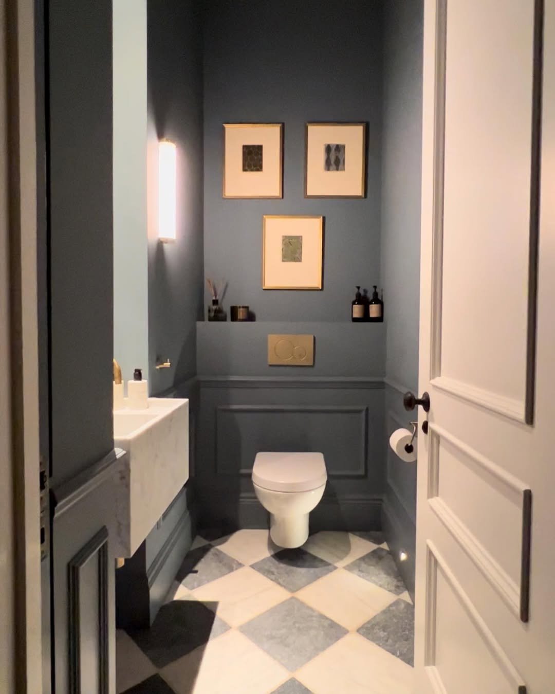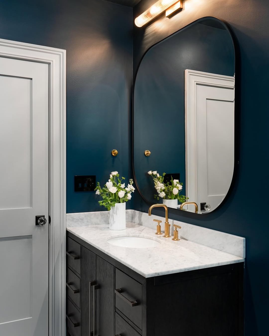 Small space, big impact. That deep blue wall color instantly wraps the room in this cozy, intimate vibe, while the lighting adds just the right amount of glow.