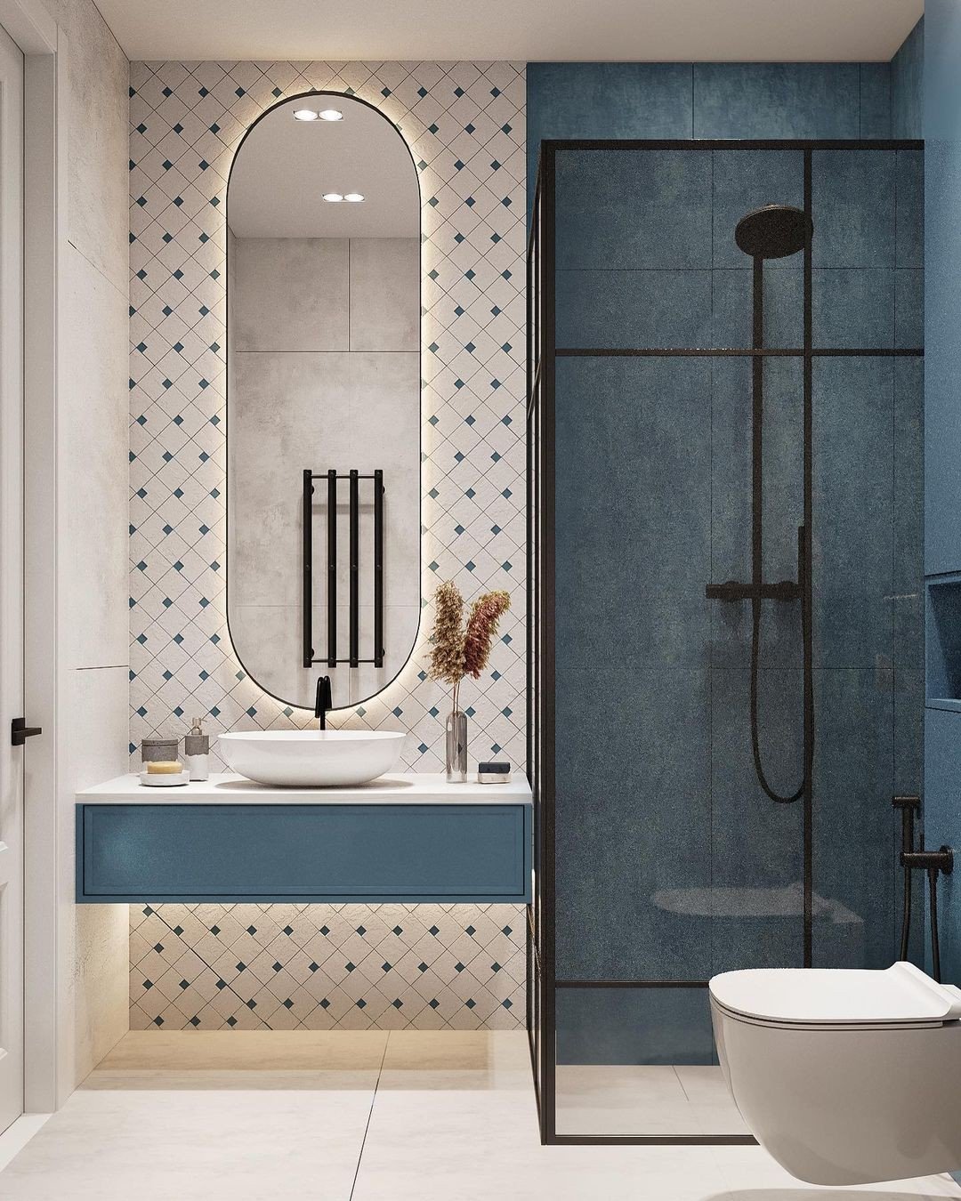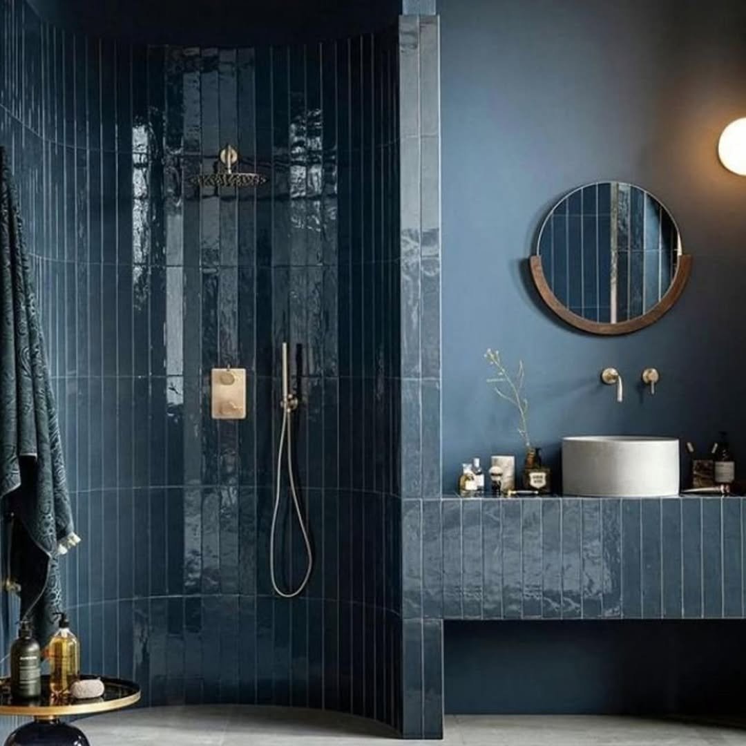 This is where blue goes deep and dramatic. The dark glossy tiles paired with matte walls create this beautiful push-and-pull between shine and softness, and it feels incredibly elevated.