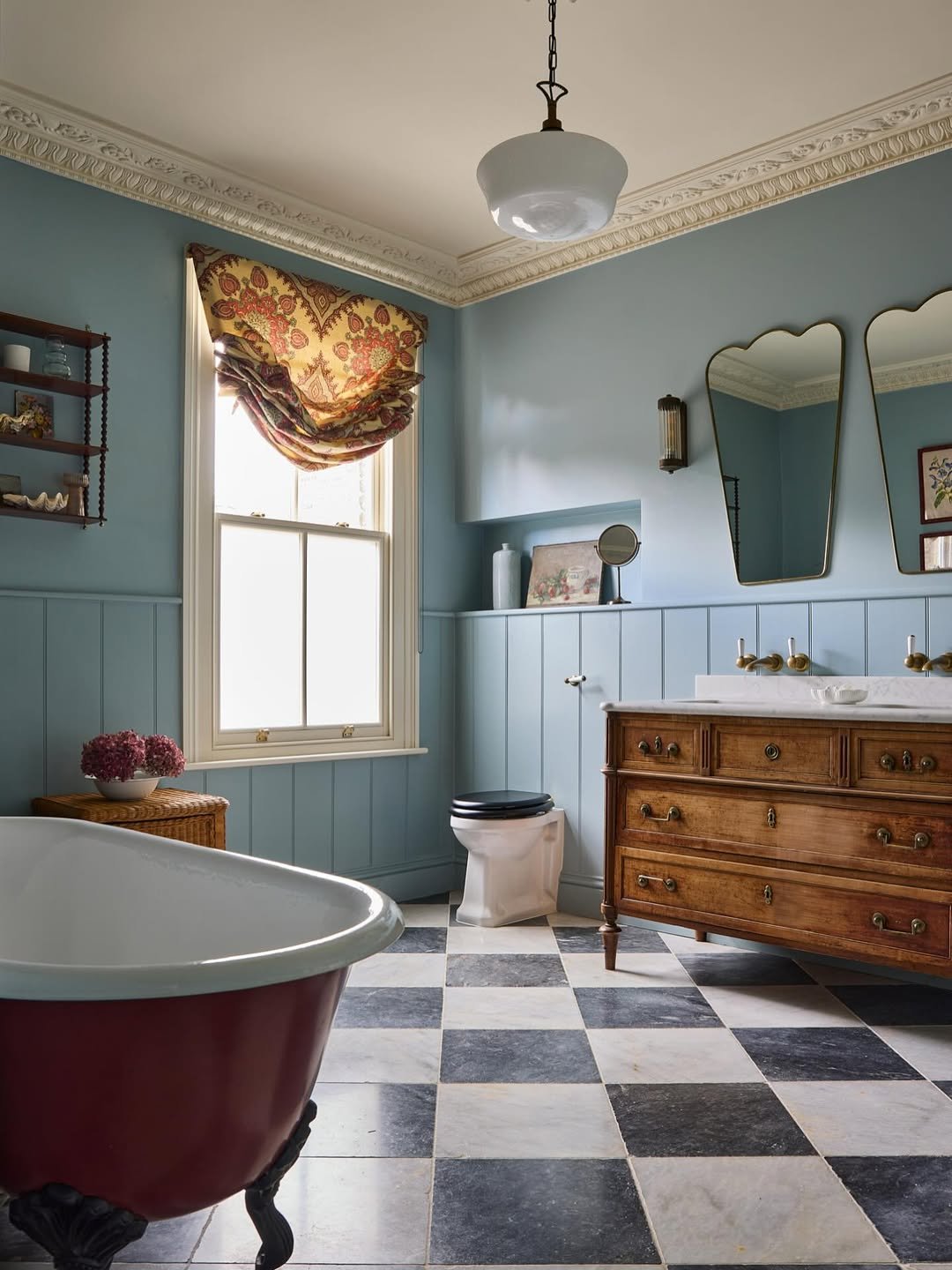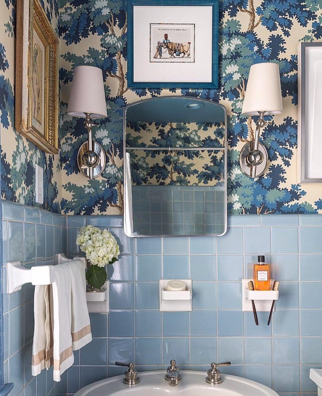 This one feels like stepping into a perfectly curated antique shop—but make it a bathroom. The mix of soft blue tiles with that intricate, almost storybook wallpaper creates layers that feel rich without being overwhelming.