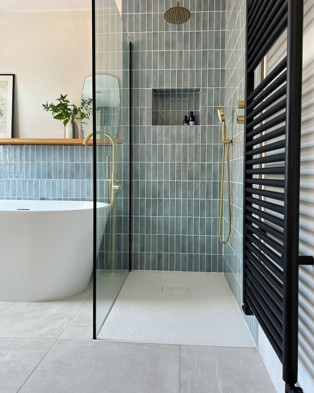 This is that clean, modern spa look done right. The vertical blue tiles elongate the space, while the glass partition keeps everything open and airy.