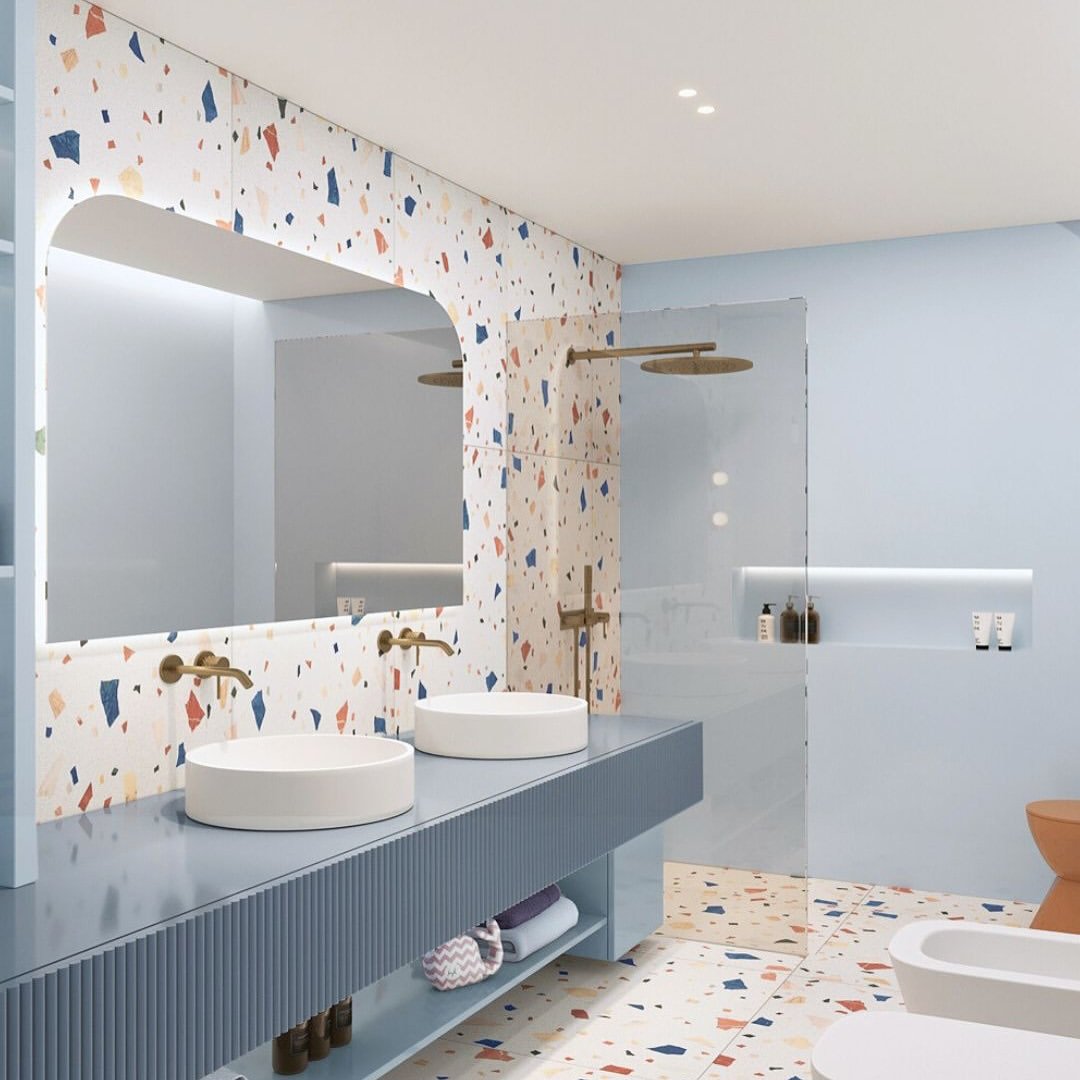 This one is pure fun. The terrazzo pattern mixed with soft blue cabinetry gives the whole space a light, modern personality that feels fresh and creative.