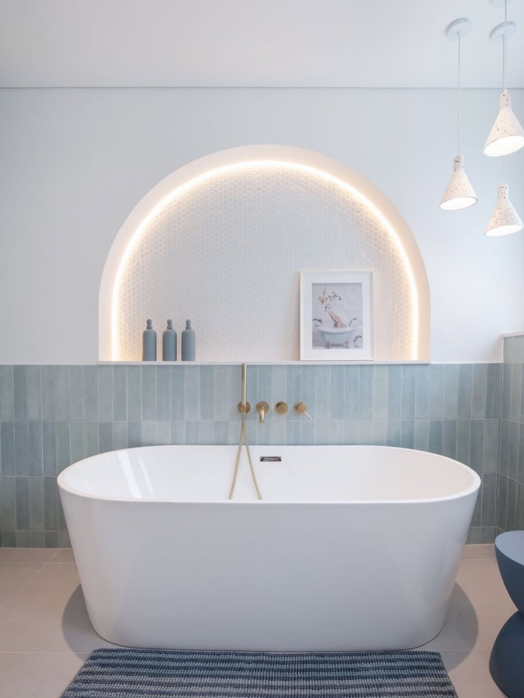 This space is giving spa energy with a twist. The soft blue tiles combined with that glowing arch niche create such a calming, almost dreamy atmosphere. It’s minimal, but every detail feels intentional.