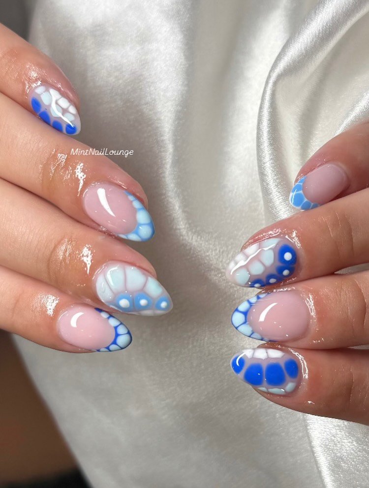 Now this is fun. Instead of a solid French, you get these abstract blue-and-white bubble textures across the tips. It’s almost like water ripples frozen into nail art form.