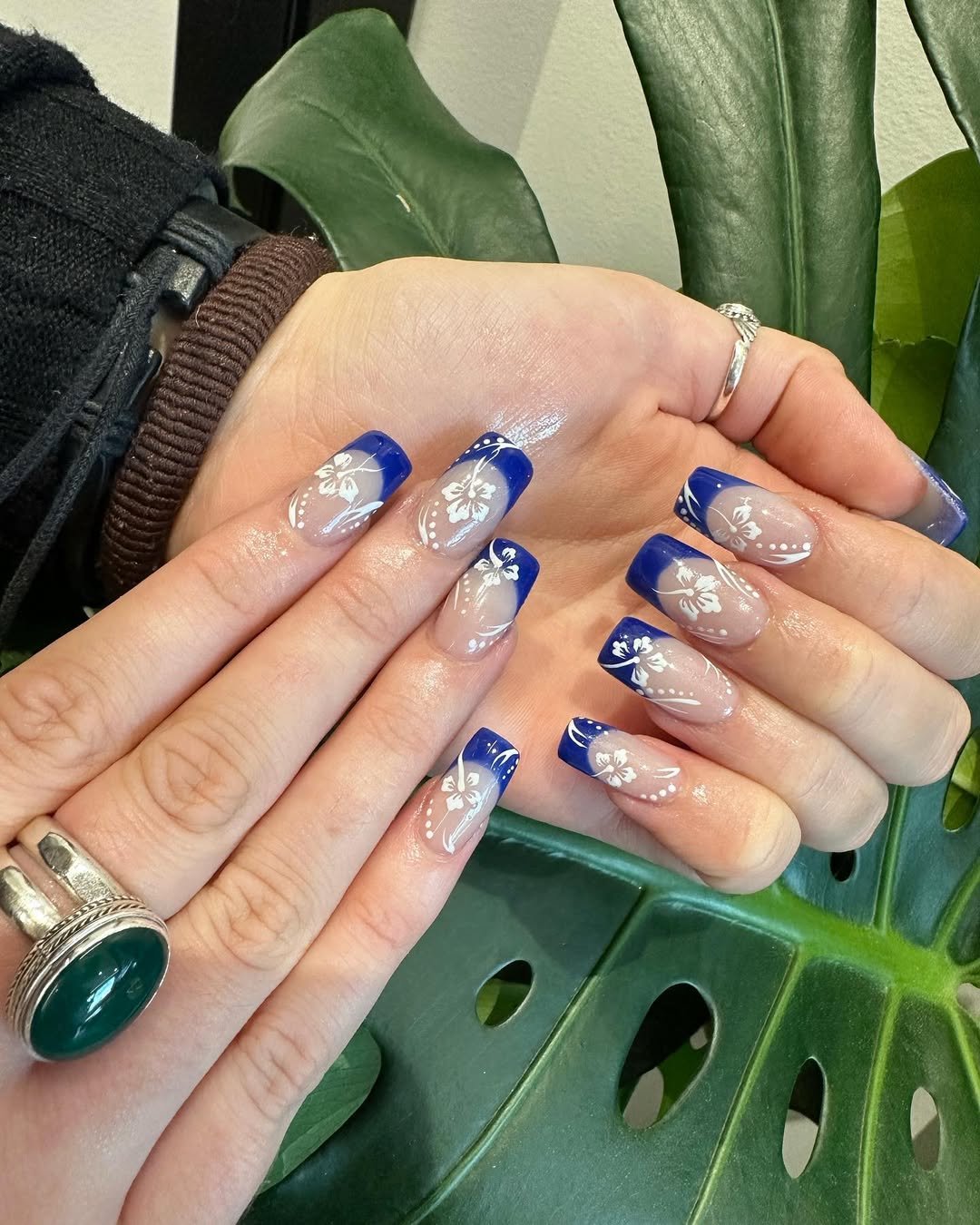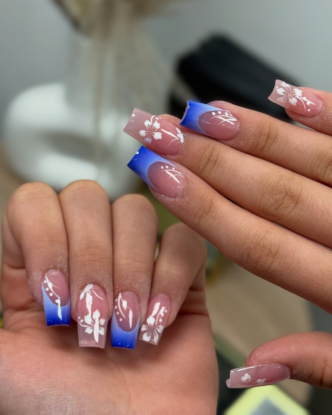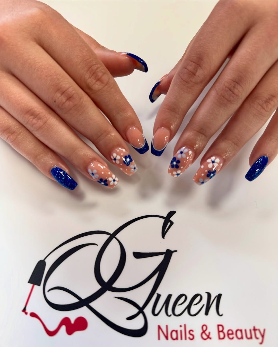 The artistry is in the balance: bold cobalt tips paired with delicate florals create contrast that pops. Perfect for when you want your nails to look polished but still bring personality into the mix.