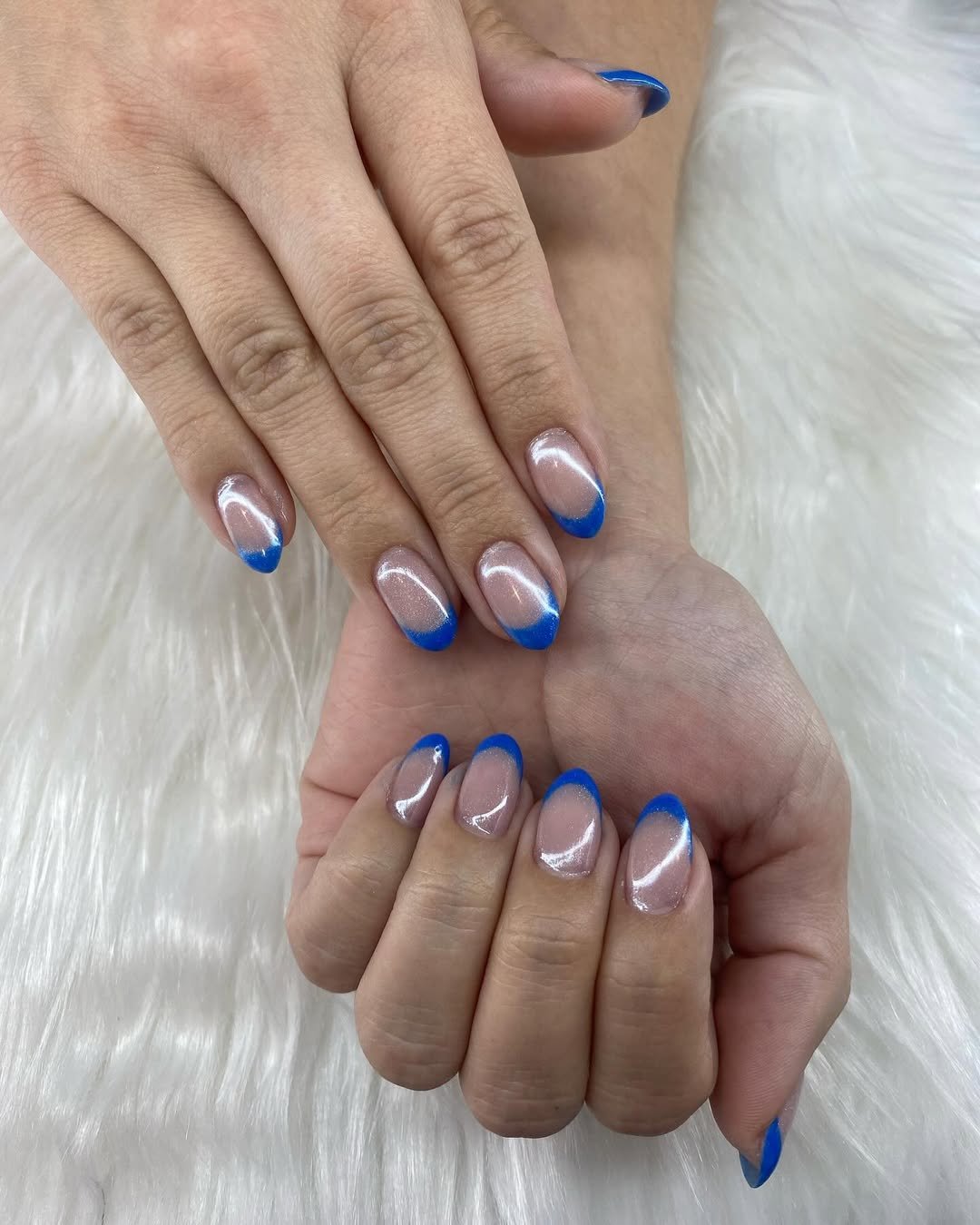 Here’s a set that sneaks in a little shimmer. The bright blue tips are paired with a nude base dusted in subtle glitter, giving it that extra glow without overpowering the design.