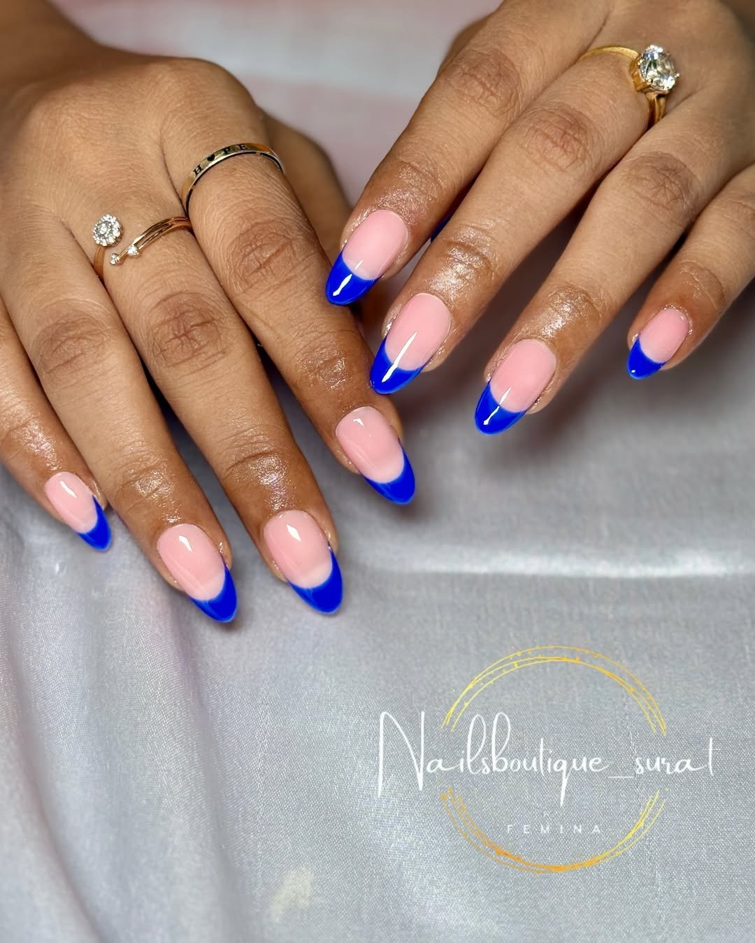 Sometimes less really is more, and this set proves it. A clean, almond-shaped French with a perfect pop of cobalt blue—no fuss, no extras, just pure chic.