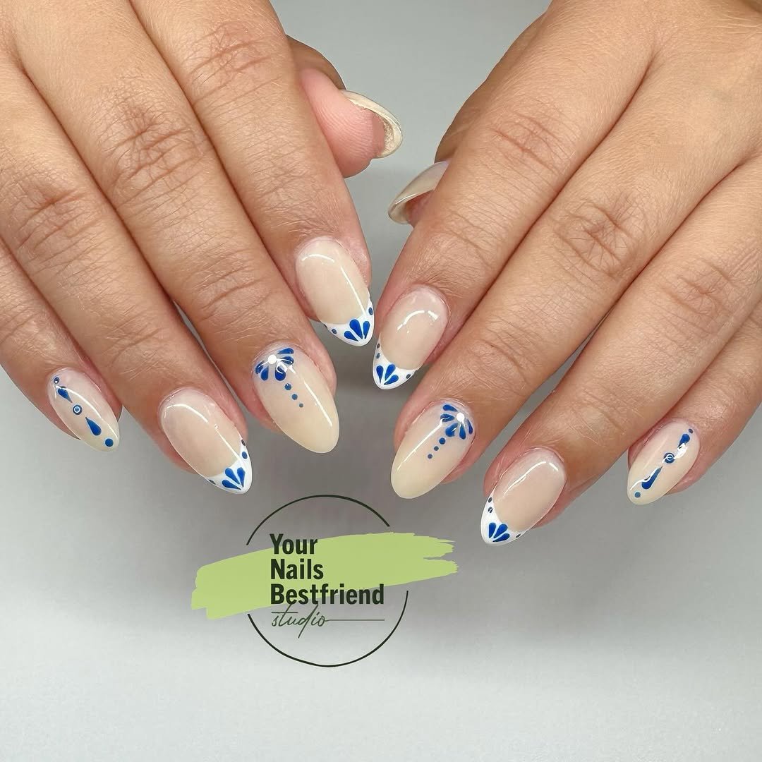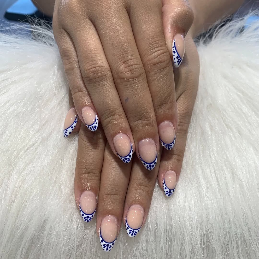 Classic French meets tropical getaway here. The crisp blue tips feel like a dive into deep waters, while the white floral detailing softens it with a breezy, vacation-ready vibe. It’s elegant without being too stiff, and playful without losing its chic edge.