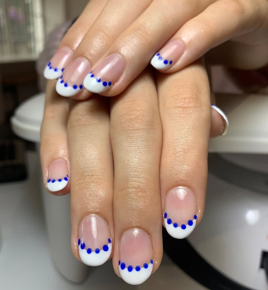 Here’s proof that even the smallest detail can make a French mani feel new again. Instead of a plain line, these tips get dressed up with tiny cobalt dots tracing the curve. It’s minimal, but with personality.