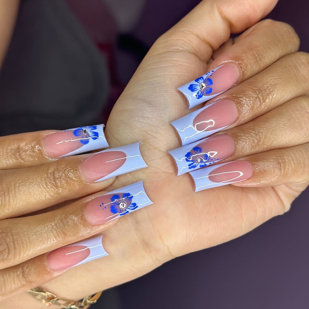 This one brings in a surprise twist: a French tip, but reimagined with blue marble accents and pink hibiscus blooms. It’s like tropical island meets chic nail bar, and honestly, the combo works way better than you’d expect.