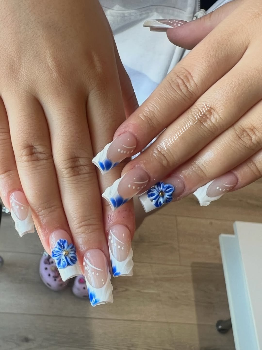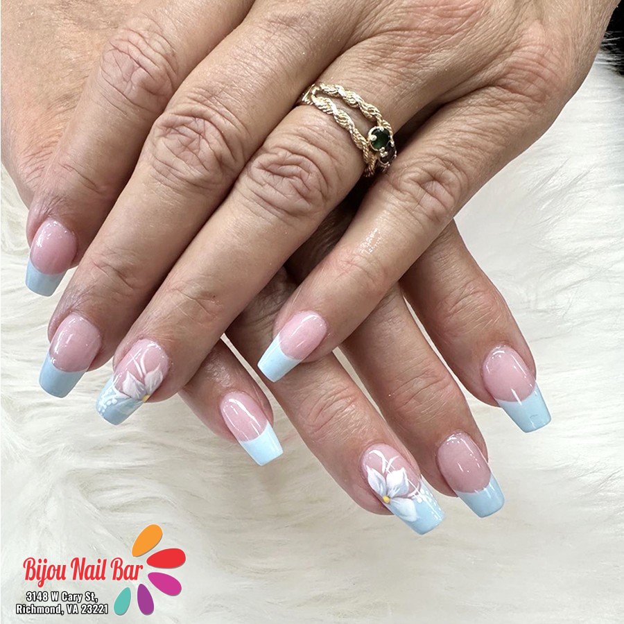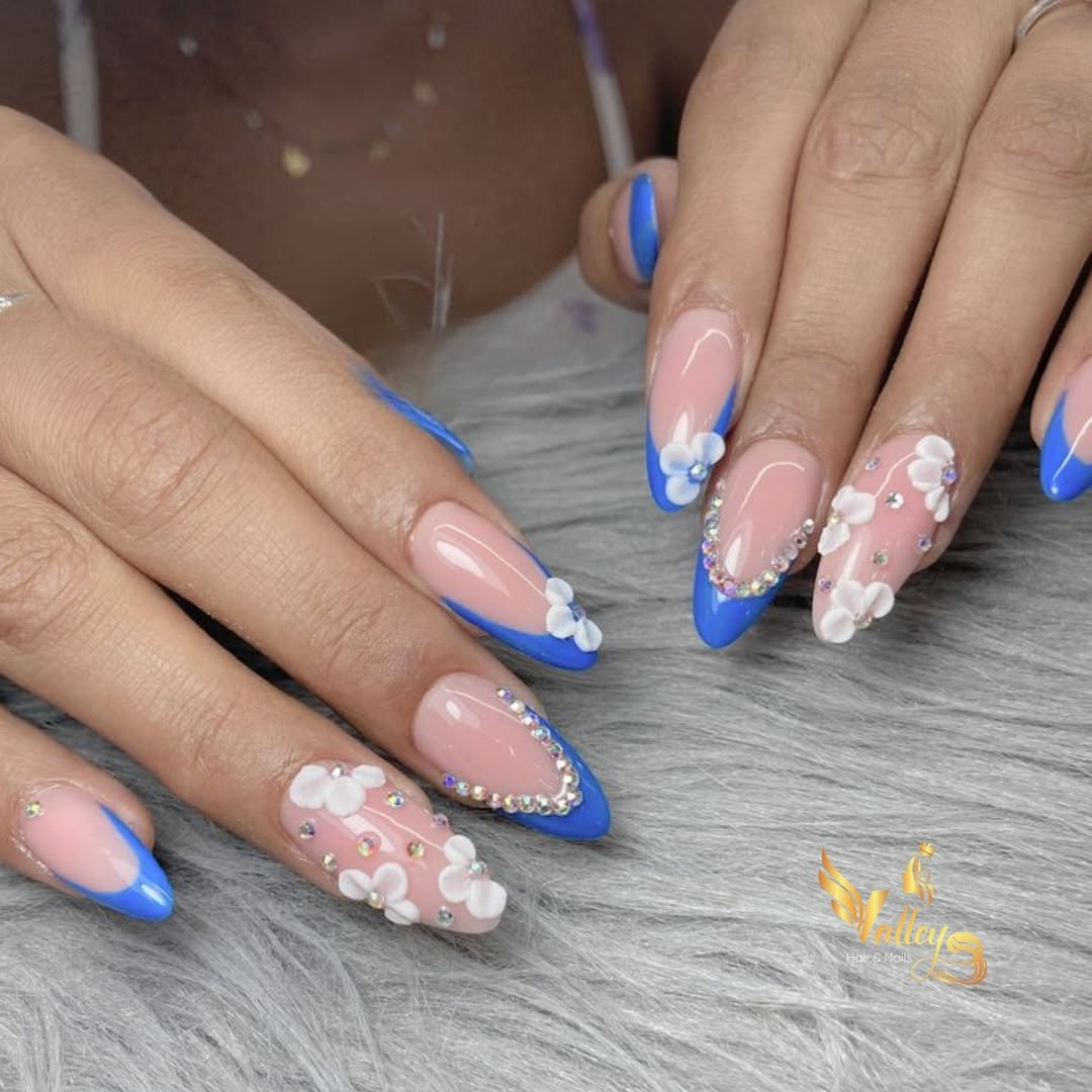 The floral detailing feels graceful, almost bridal, while the blue tips add a fresh pop that keeps it from going too formal. It’s feminine without being overdone.