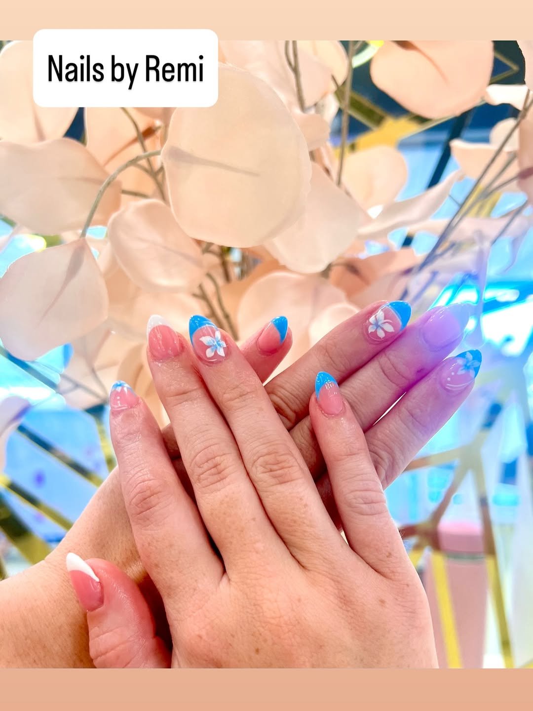 The pink flowers are bold and detailed, almost stealing the spotlight, but the blue tips keep everything cohesive. It’s the kind of design that doesn’t shy away from being extra, and that confidence is half the charm.