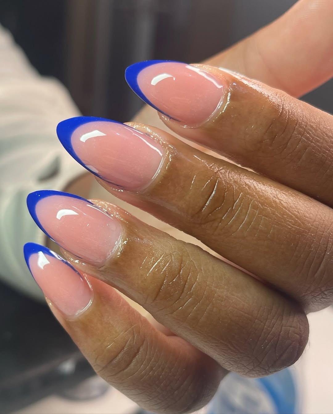 If you want a French that means business, this is it. That deep cobalt tip is razor-sharp against a nude base, and the almond shape adds just the right amount of edge.