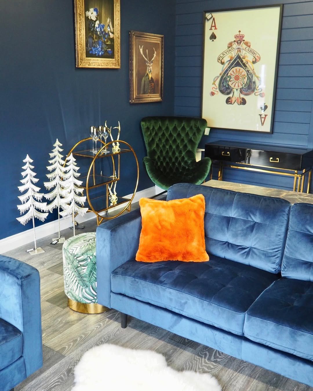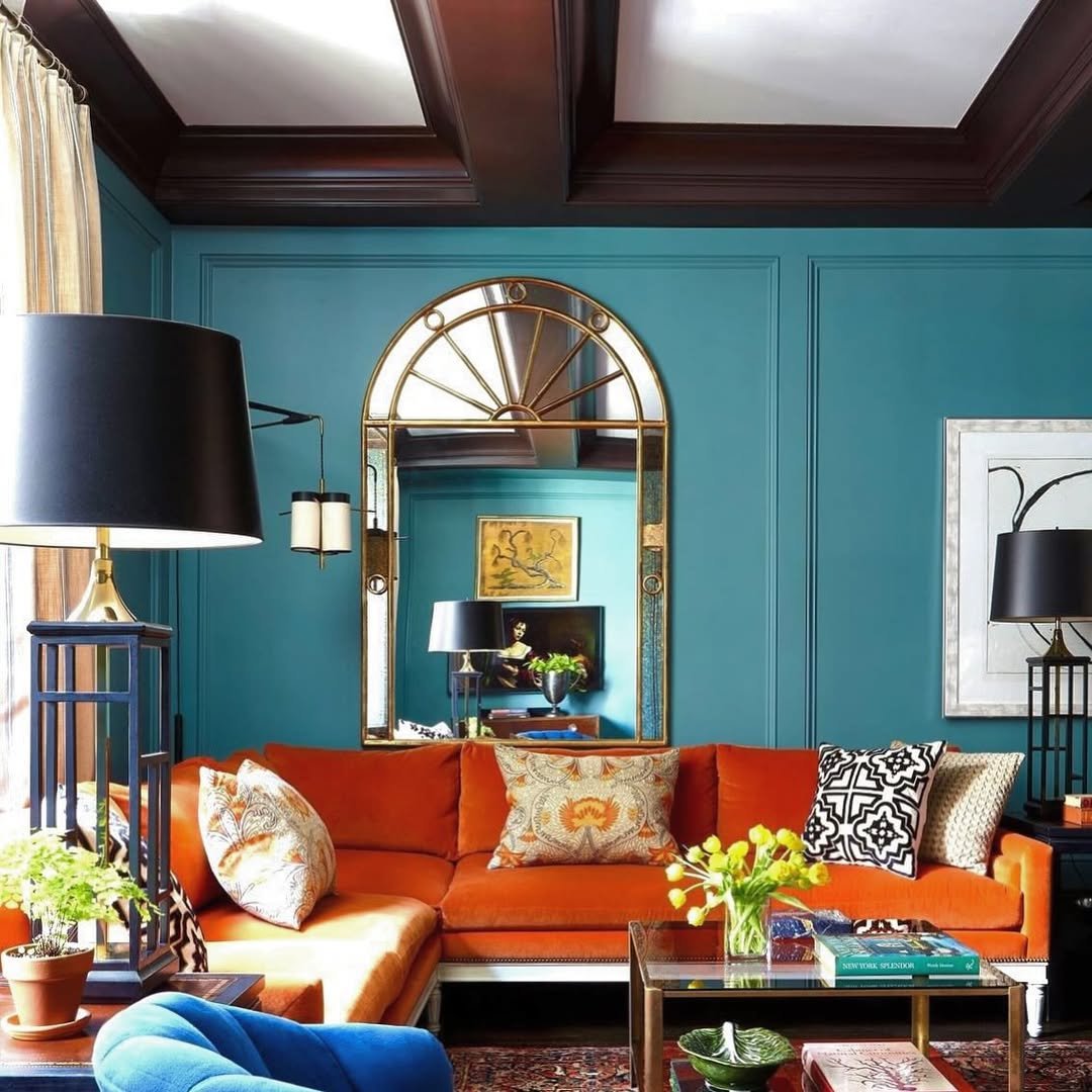 This room isn’t shy—and it doesn’t need to be. Deep blue walls, gold accents, and that punchy orange cushion create a look that’s full of life.