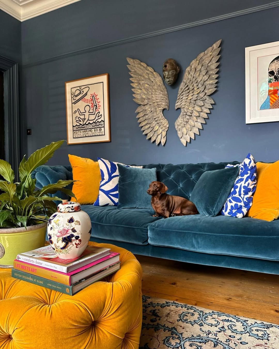 This one brings personality right away. The rich blue sofa paired with mustard tones and playful decor makes the whole room feel alive.