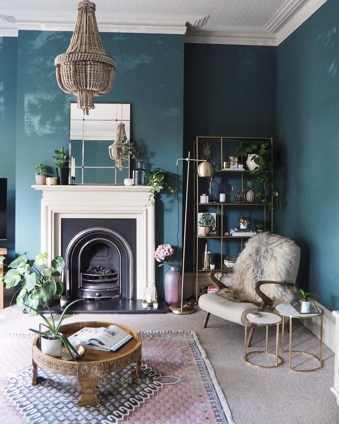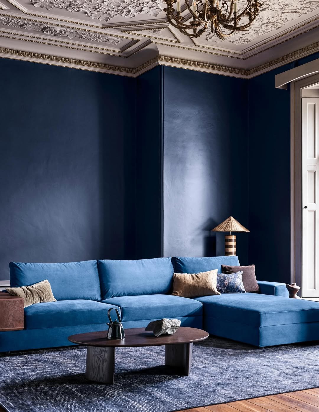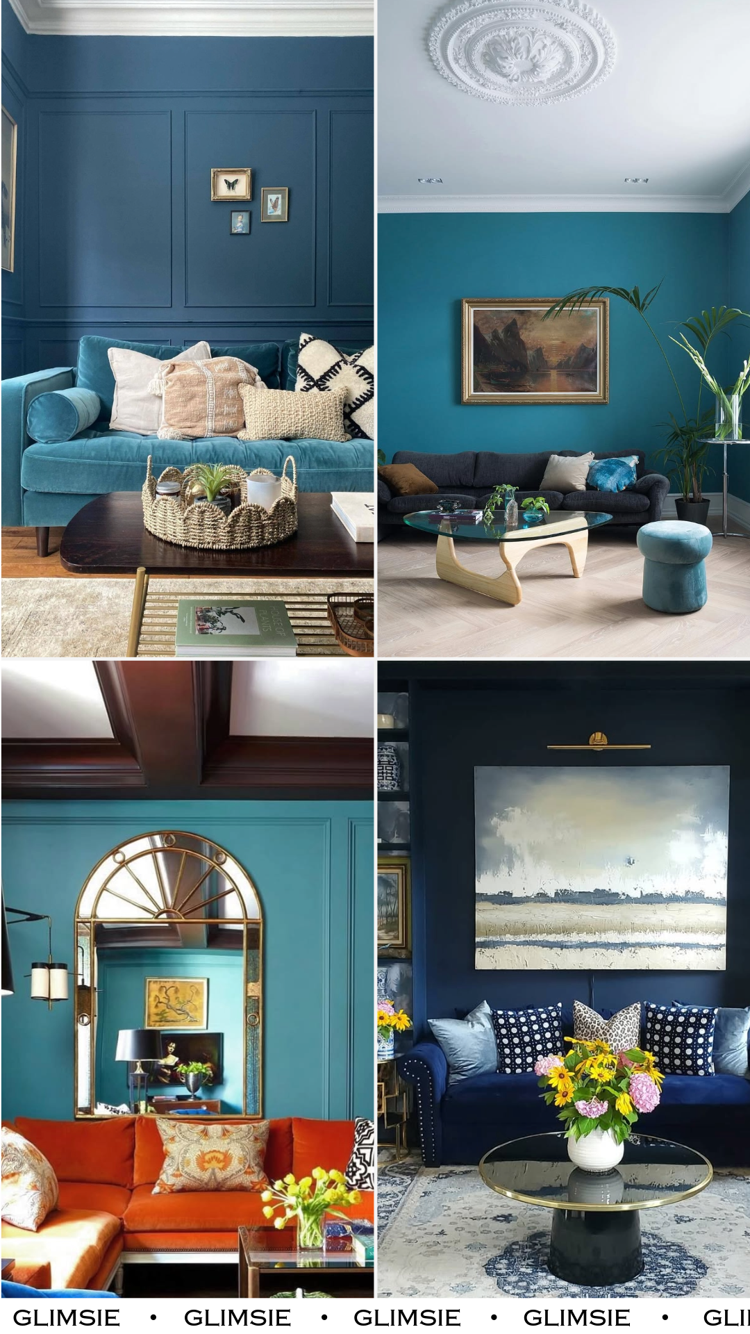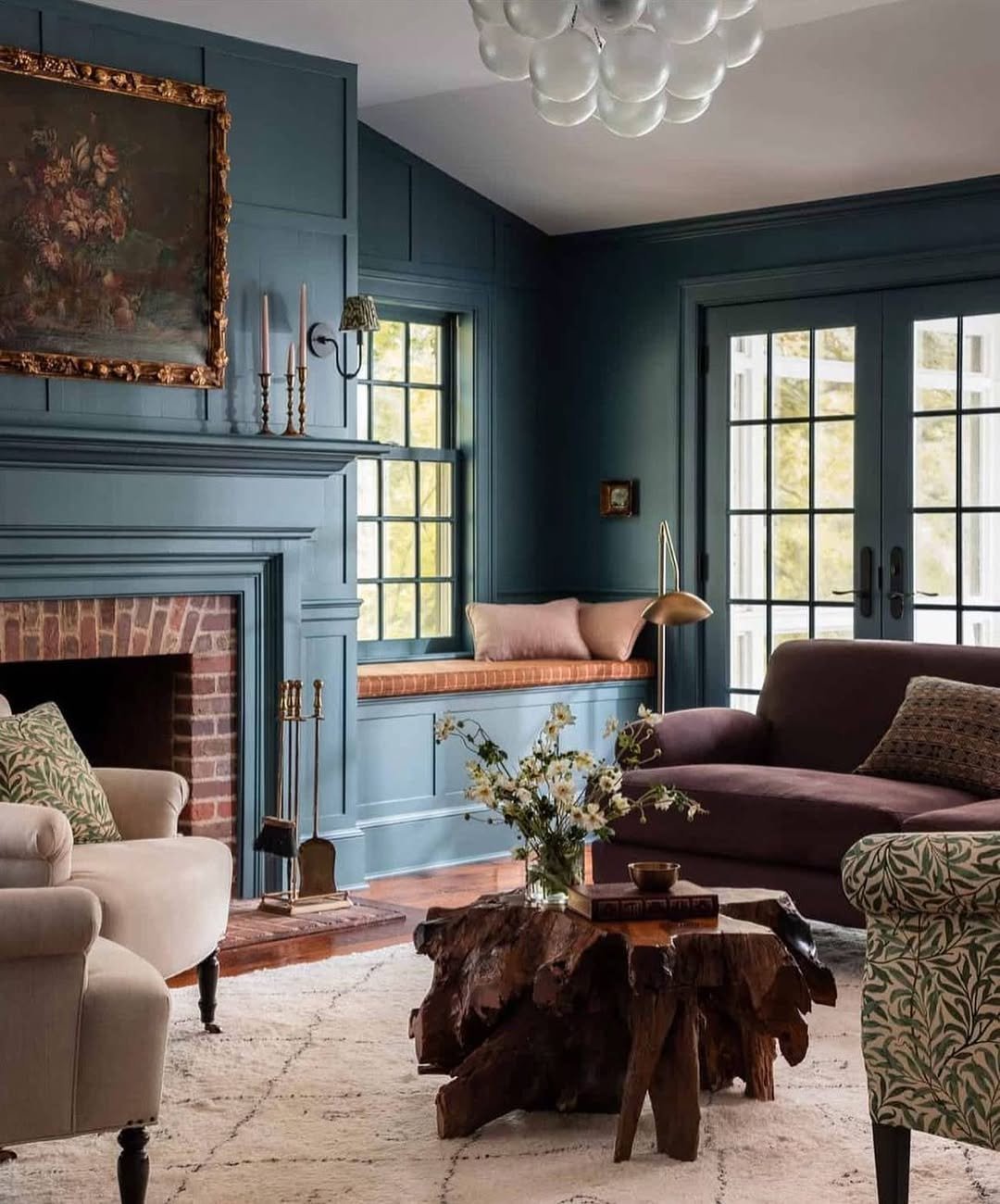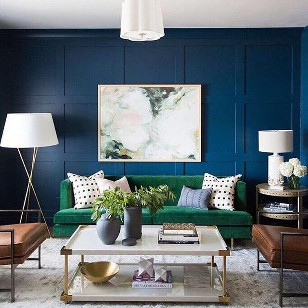 This one plays with contrast in a softer way. The deep blue wall paired with that green sofa creates a layered, earthy feel that’s both bold and grounded.