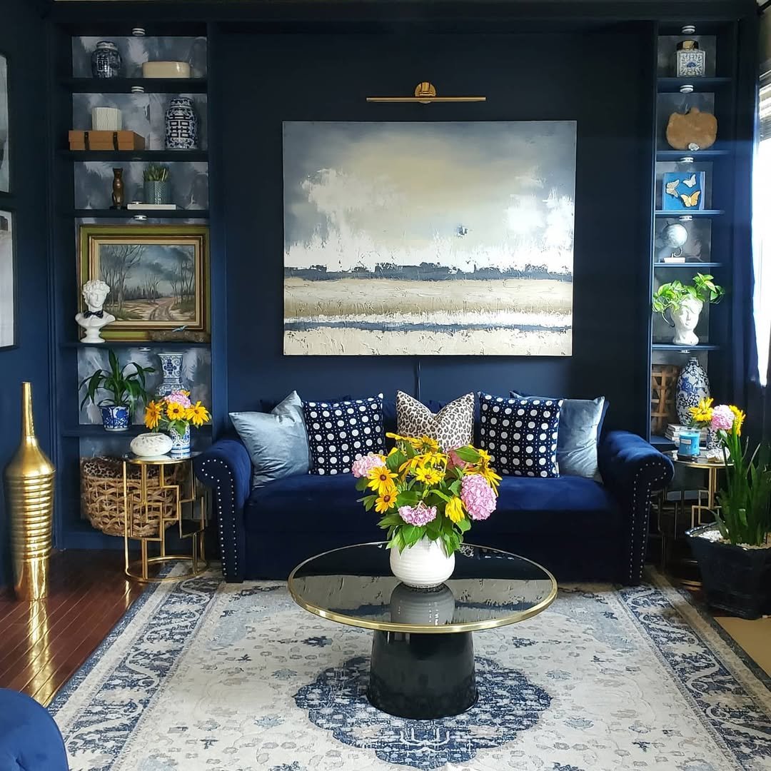 This space feels rich in the best way. The deep navy backdrop paired with gold accents and soft florals gives it that elevated, almost boutique-hotel vibe.