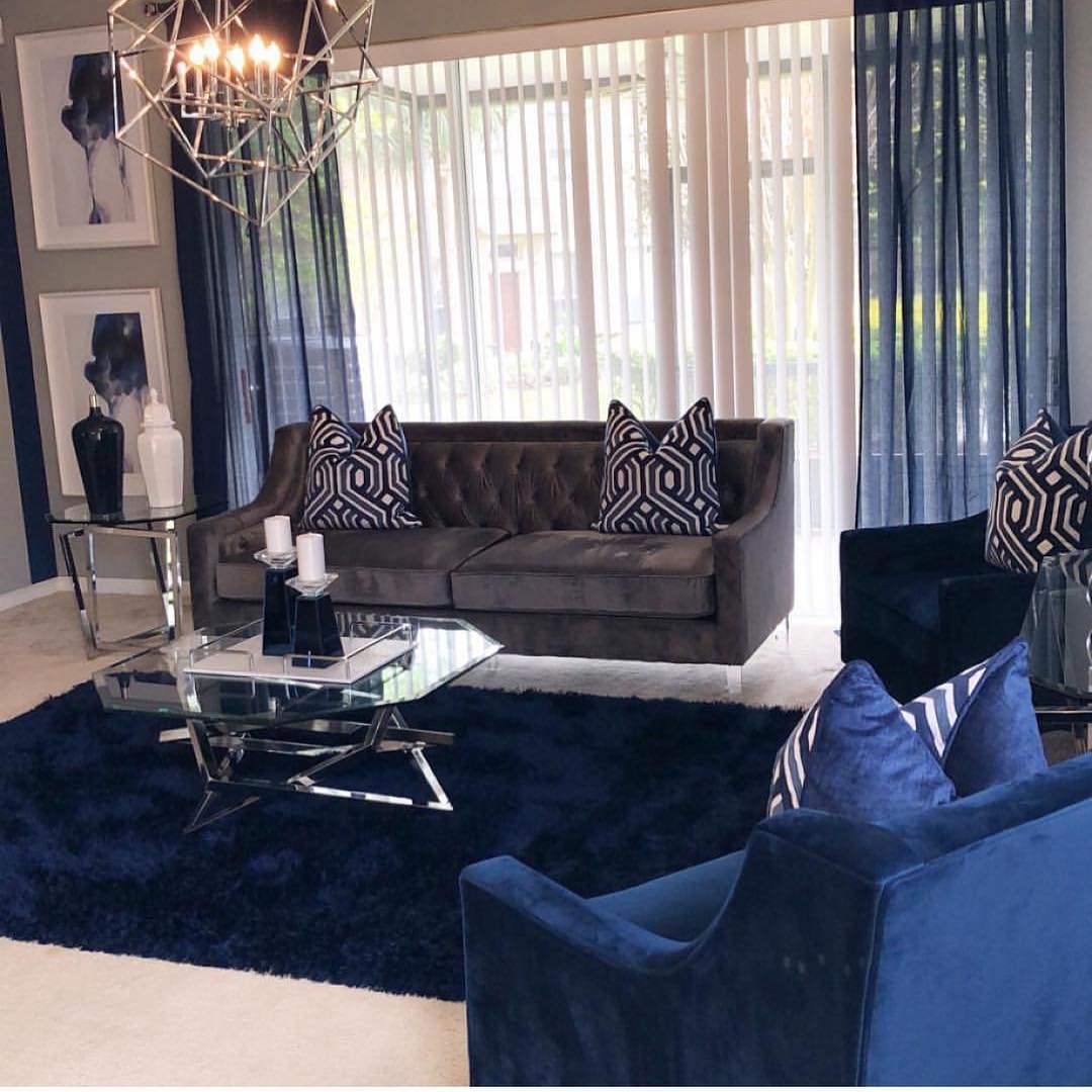 This room feels like a full experience. The deep blue walls, statement lighting, and mixed seating create a space that feels both luxurious and welcoming.