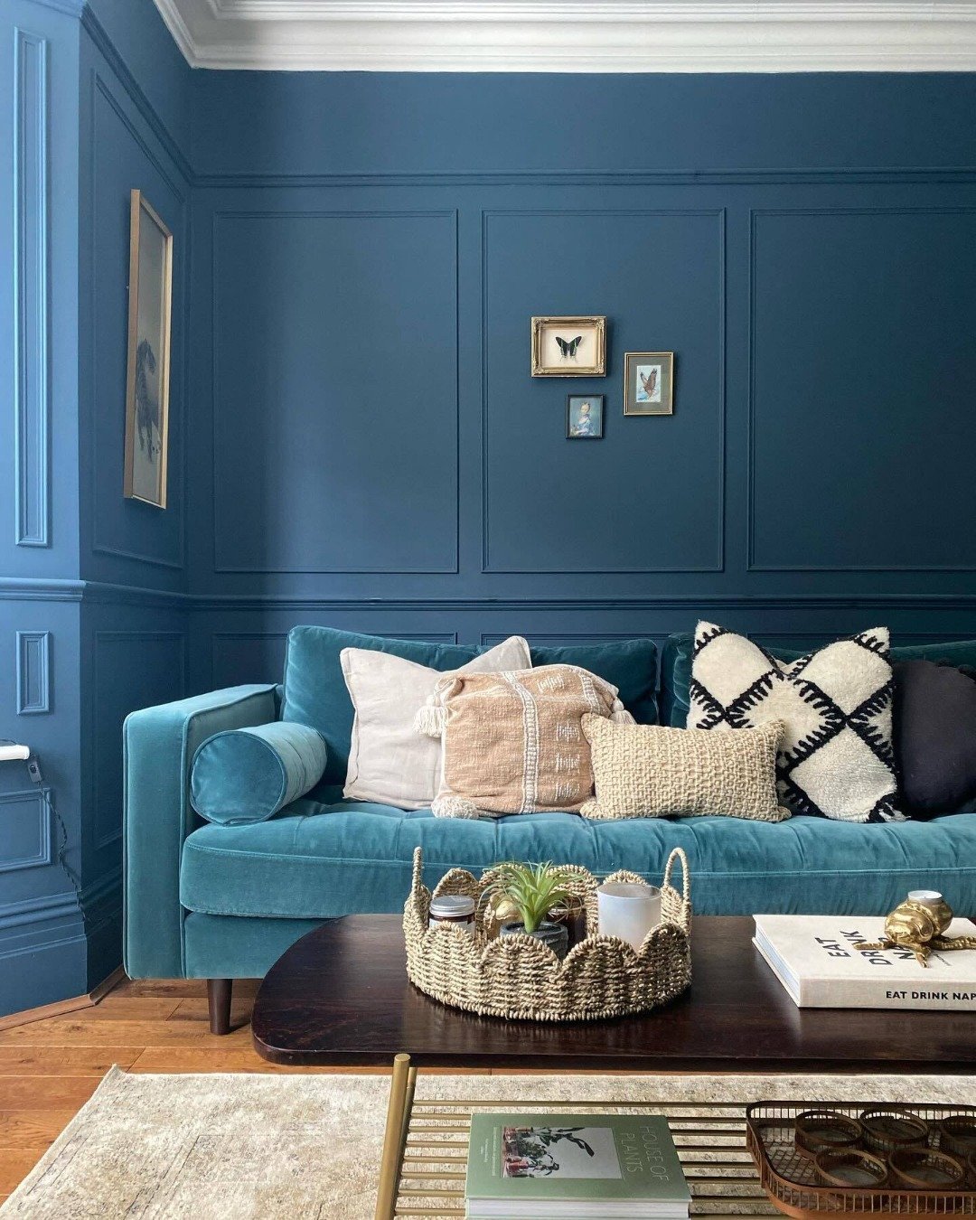 That paneled blue wall instantly elevates everything. Add in soft furnishings and subtle patterns, and you’ve got a space that feels classic but still fresh.