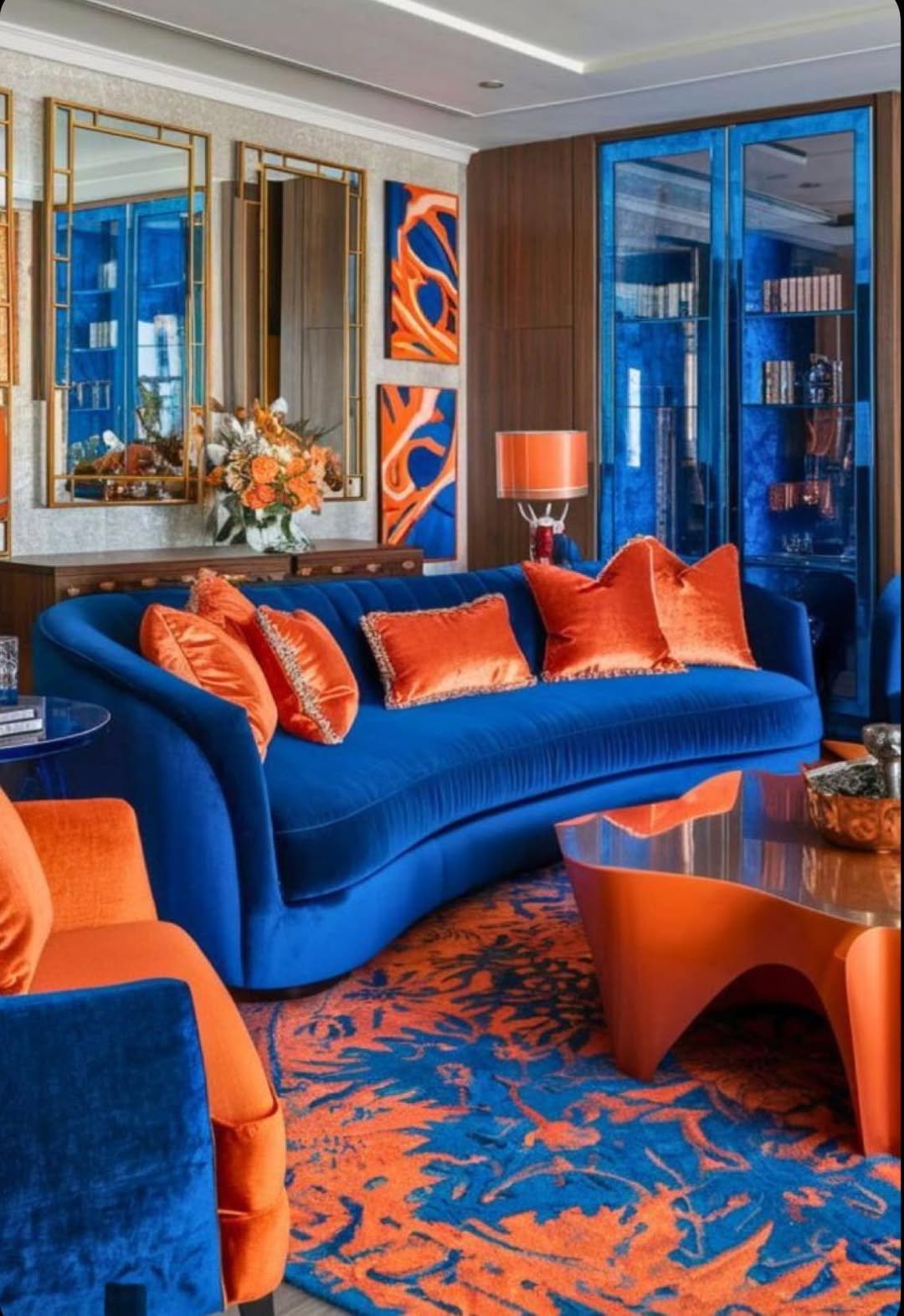 This space is bold in the best way. That vibrant blue sofa against punchy orange accents is impossible to ignore—and honestly, why would you want to?