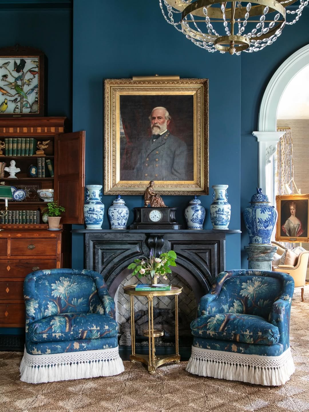 This room feels like it has stories to tell. Ornate ceilings, classic furniture, and rich blue walls bring in that old-world charm.