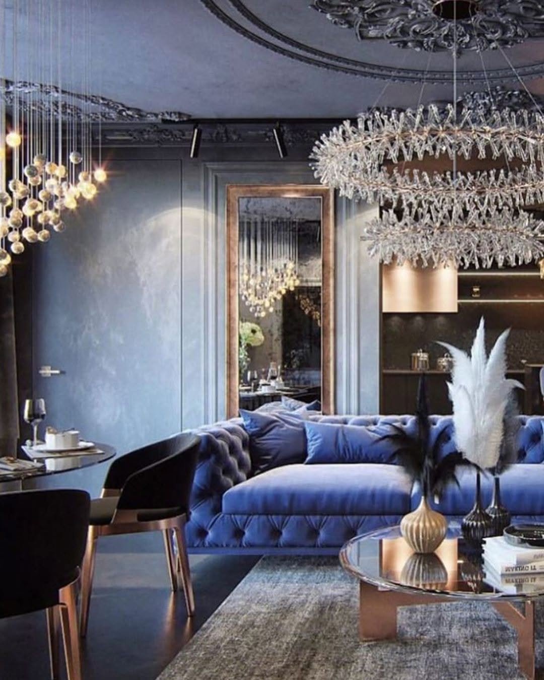 This is full-on glam energy. Velvet blues, sculptural lighting, and metallic finishes all come together in a way that feels bold but still super polished.