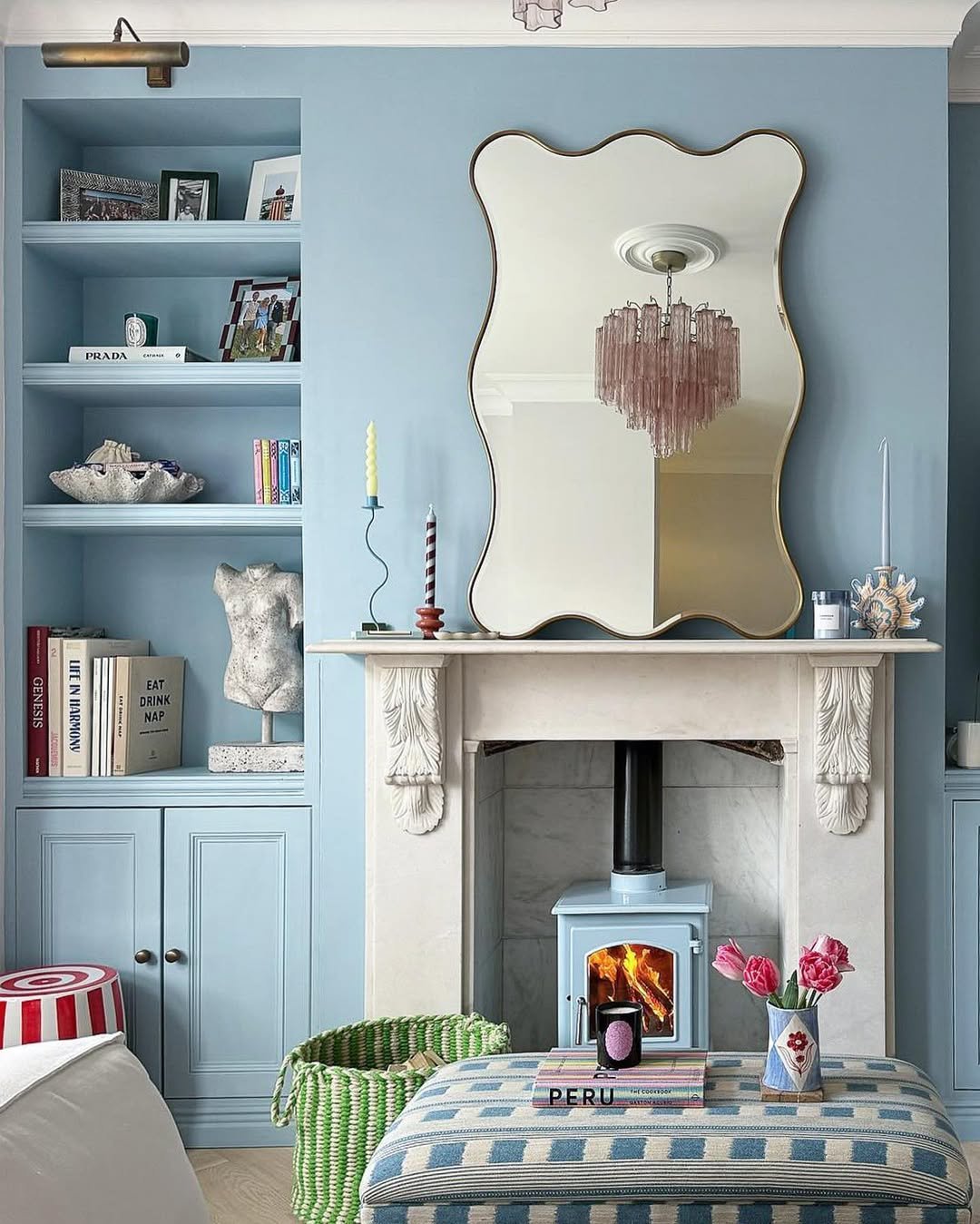There’s something instantly comforting about this setup. The soft powder blue walls, curved mirror, and cozy fireplace make it feel like a calm little retreat.