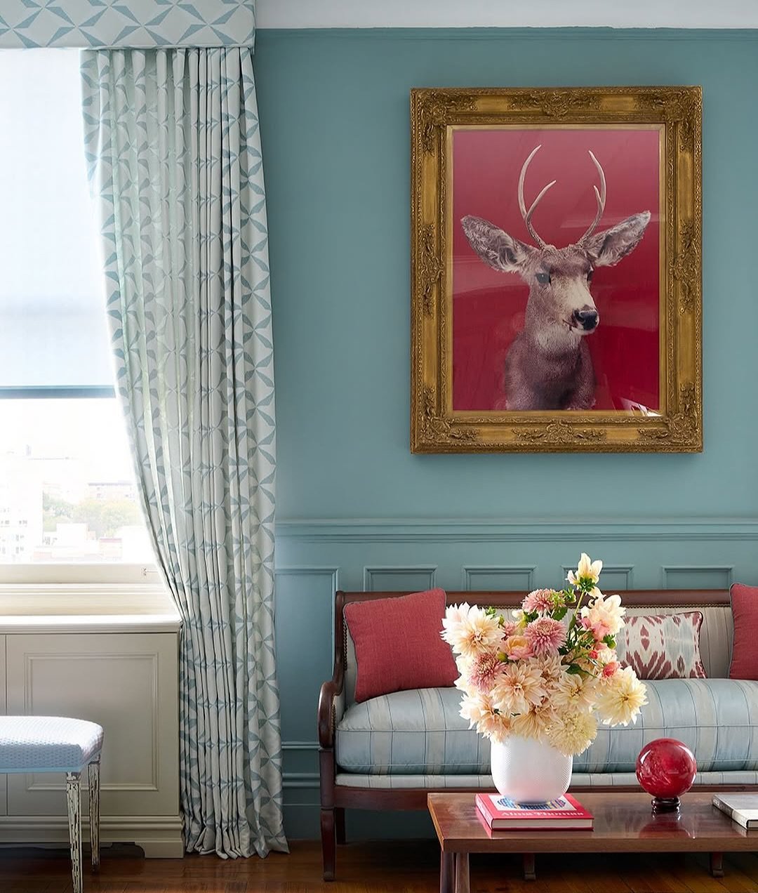 This one feels like a breath of fresh air. That muted blue wall paired with delicate florals and warm wood tones creates a space that’s elegant without feeling stiff.