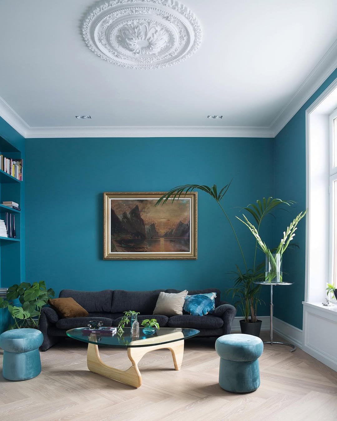 This room leans into that clean, airy Scandinavian vibe—but with a deeper twist. The teal walls bring in mood, while the light flooring and minimal furniture keep it feeling open and fresh.