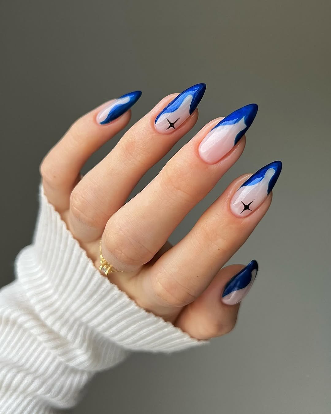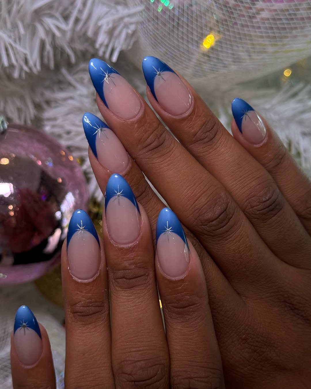 @nailsbytrinnie’s take on the French manicure is giving pure night-sky energy. The deep cobalt tips, each crowned with a starburst of silver, are bold yet minimal — like starlight on a winter’s night.