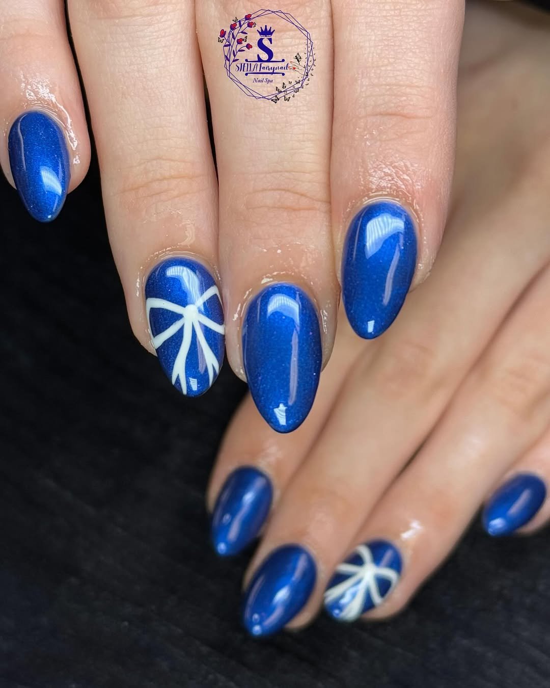 @stella.fairynail finishes this batch strong with a royal blue polish wrapped up in crisp white bow details. It’s festive, feminine, and totally joyful — like unwrapping the perfect winter gift.