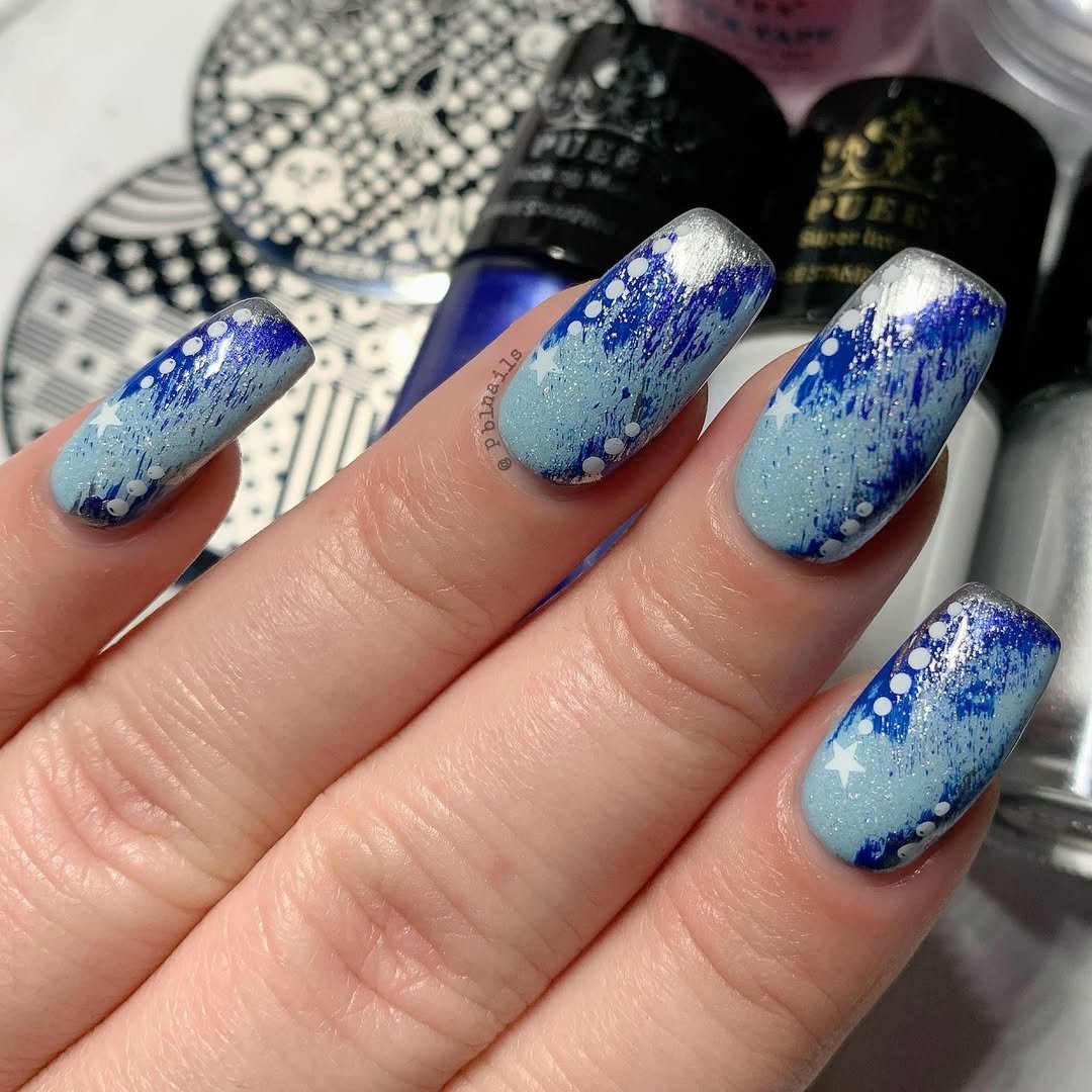 @pblnails goes bold with a painterly take on winter blues — icy gradients, splattered silver, and dotted snow details that look like a hand-painted storm. It’s creative, unexpected, and still totally wearable.