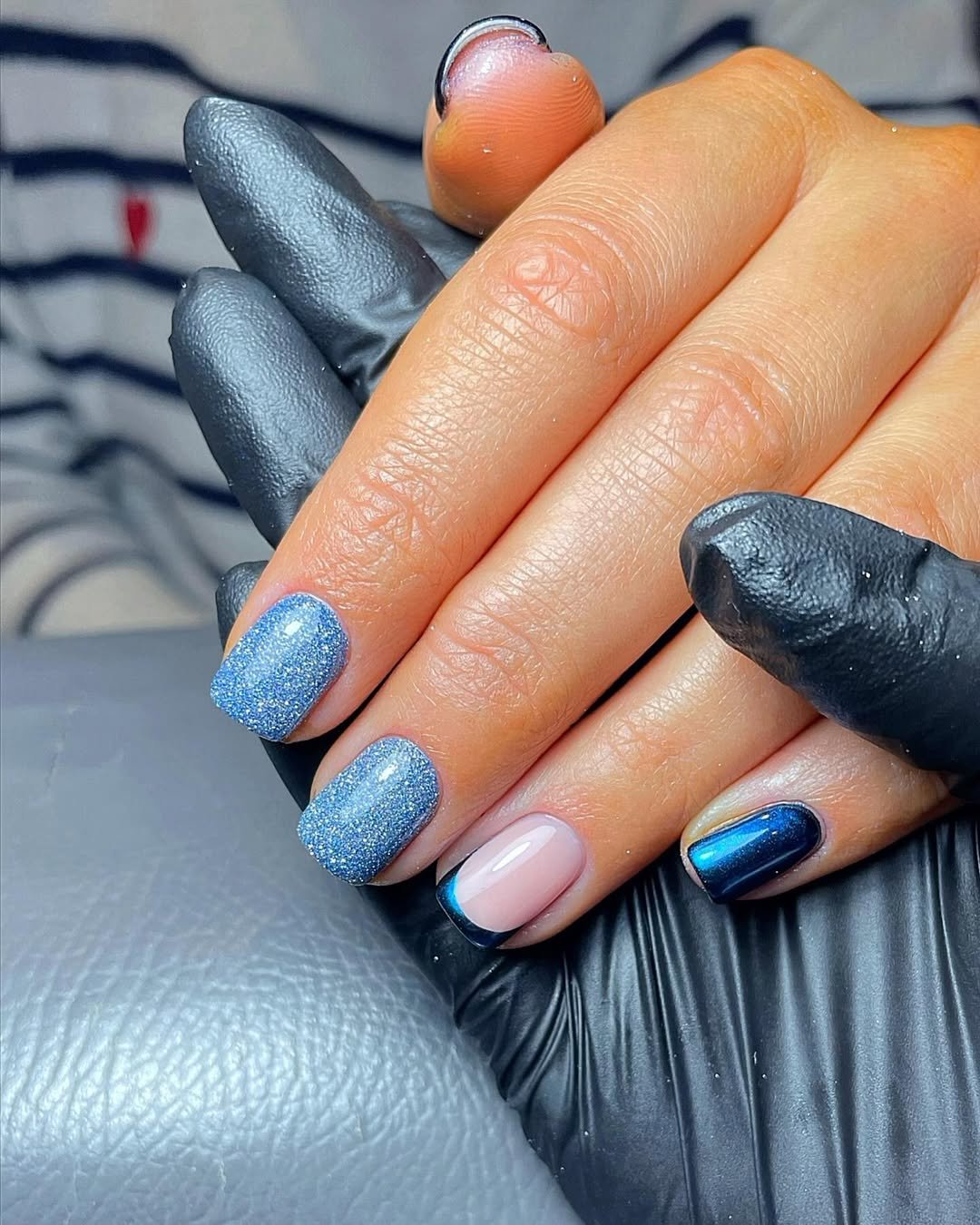 @nails.by.iz_ serves up the perfect winter combo — a little shimmer, a little shine, and a clean modern twist. From sugar-dusted blue sparkles to a sleek French tip outlined in midnight chrome, every nail feels intentional yet effortless.