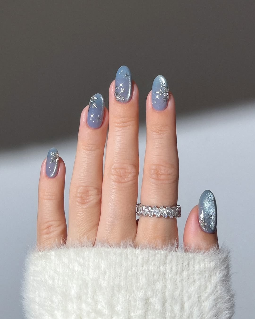 This set from @heygreatnails is basically the frost queen’s go-to look. The gradient shift from soft silver-blue to icy gray is dreamy, while delicate sparkles and silver accents mimic the glint of frozen snow.