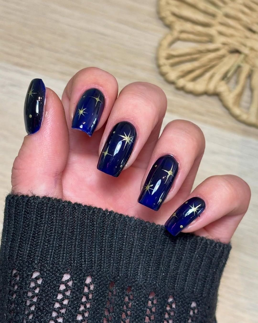 @nailpolishdirect goes bold with a deep indigo base scattered with golden stars. It’s moody and magical — like looking up at a clear night sky in the dead of winter.