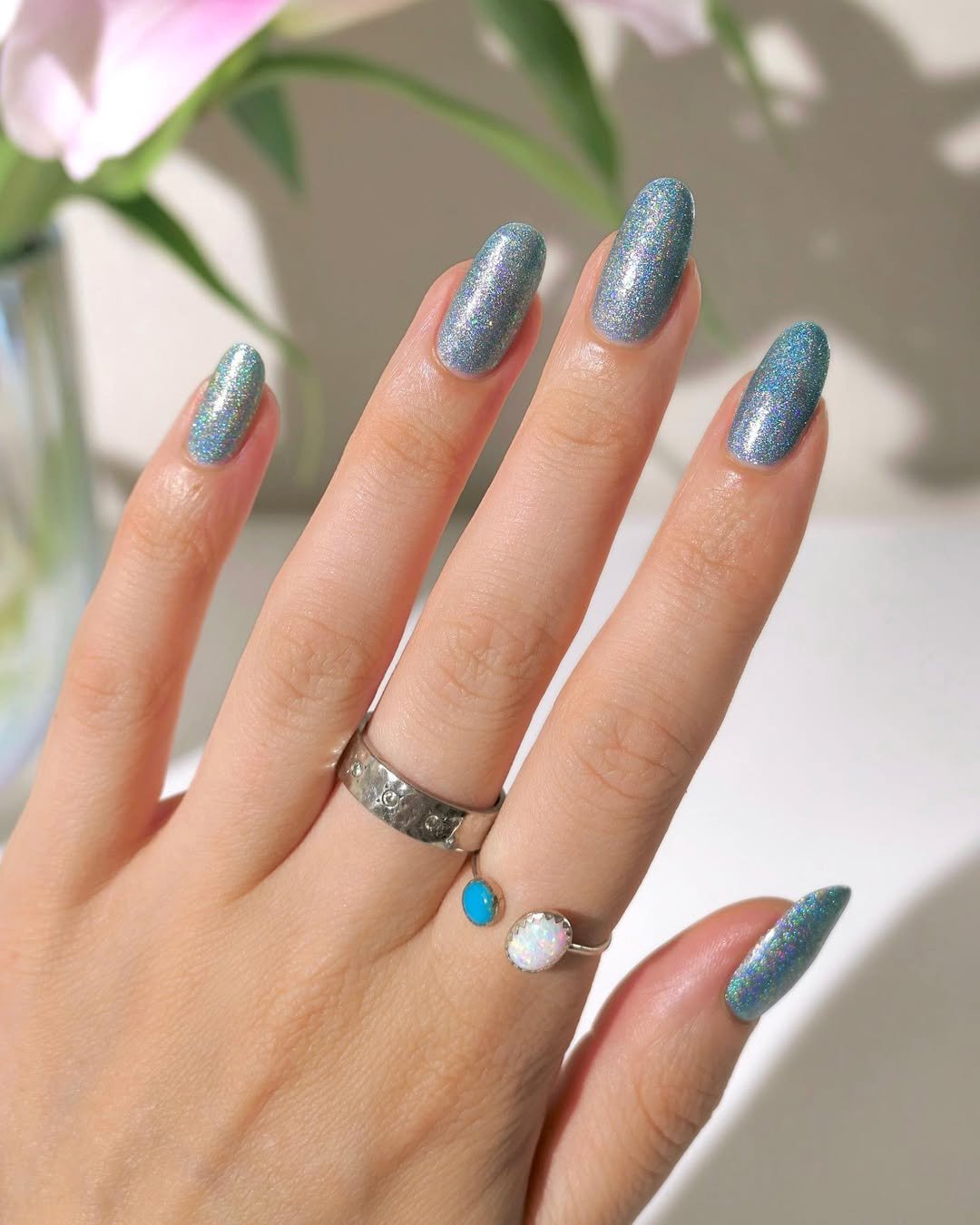 @danaturenails gives frosty blue a whole new life with this holographic shimmer that catches every glint of winter light. The multi-dimensional glow feels both ethereal and futuristic—like tiny glaciers on your hands.