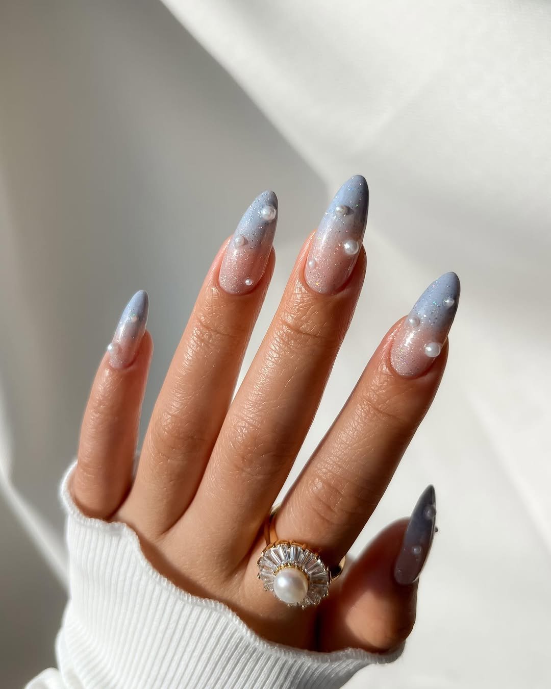 @mydumbnails delivers a frosty fantasy with these icy ombré nails kissed with tiny pearls. The gradient from blush to icy lavender gives “frozen dew on petals” energy in the best way.