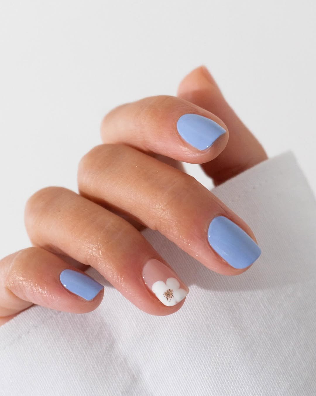 This @m.o.n.a.j look is winter minimalism done right. A pearlescent baby-blue sheen catches the light with every move, adding instant sophistication to an otherwise simple manicure.