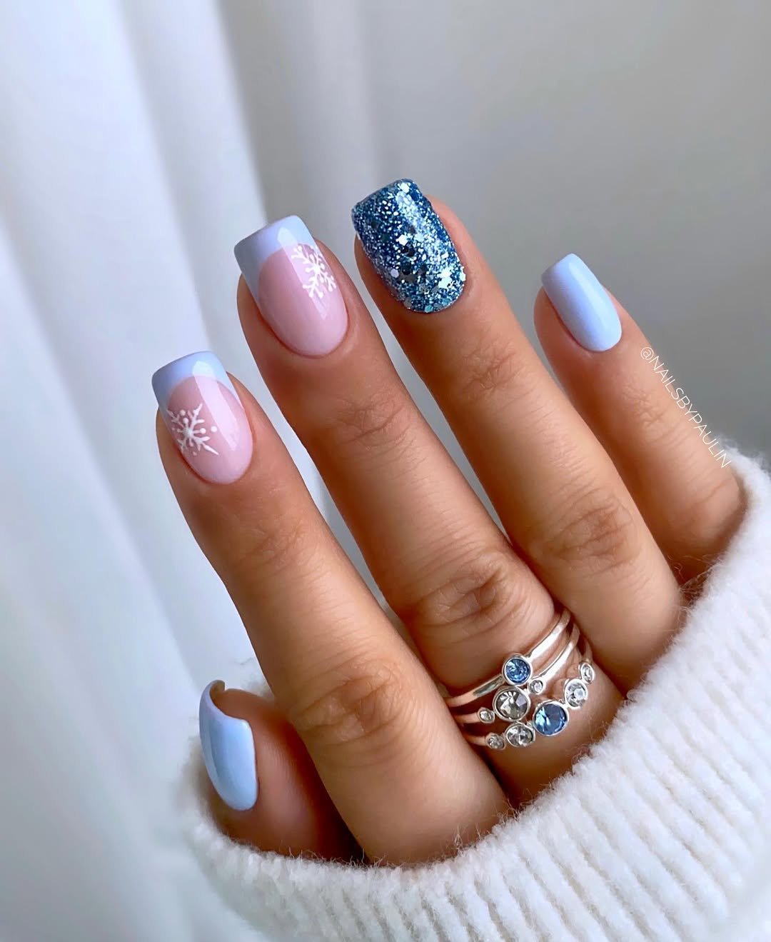 @nailsbypaulin makes winter magic look easy with icy blue tones, sparkly accents, and soft snowflake details. The frosted French tips feel fresh, not fussy, while that glitter-drenched statement nail is pure holiday spirit.