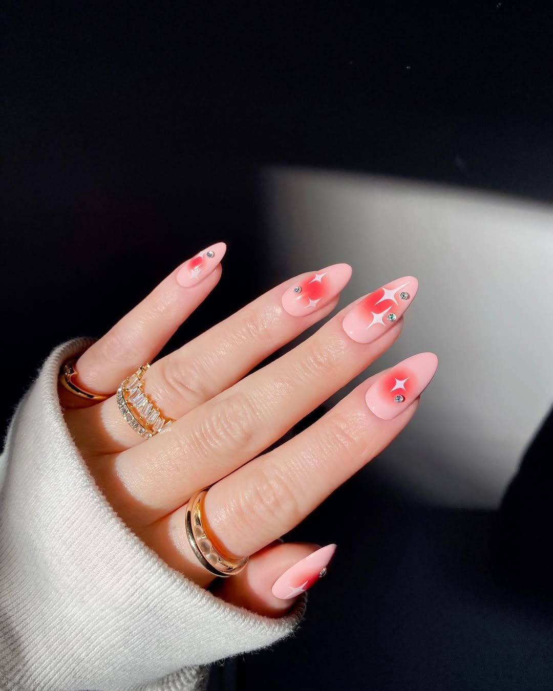 Soft, matte, and just a bit celestial — @xjuliatalisman’s blush nails with glowing starbursts are straight-up mesmerizing. The diffused pink background creates that dreamy, “lit from within” glow.