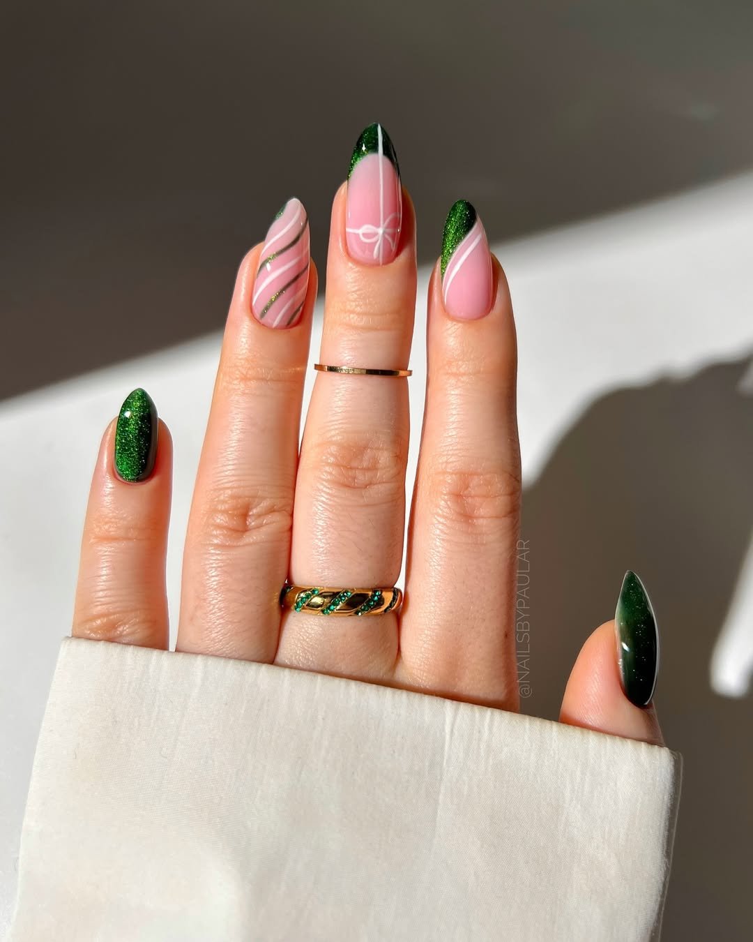 @nailsbypaular delivers a festive twist on blush pink with this green-and-pink combo that feels like the chicest holiday present. The deep emerald shimmer contrasts perfectly with the soft pink base, tied together by delicate white ribbons and swirls.