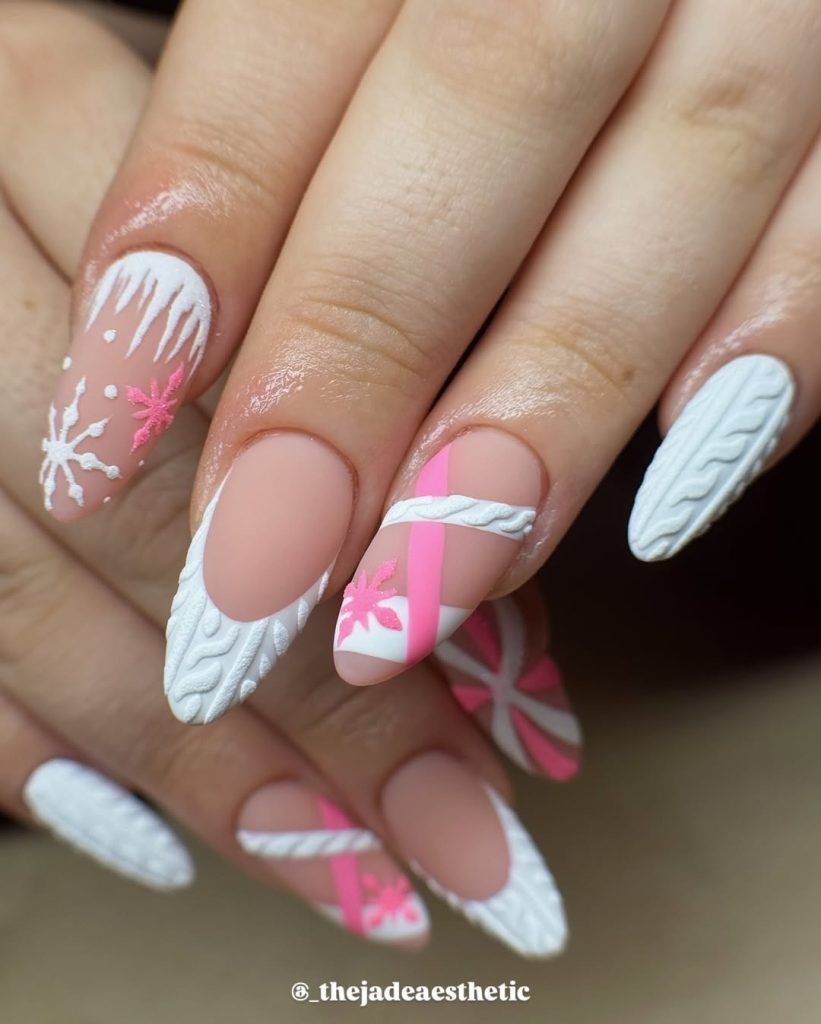 @stellar_gel combines knitted sweater textures with a pink-and-white winter palette that’s straight out of a snow-globe dream. The contrast of matte pink and raised white designs makes this look both cozy and intricate.