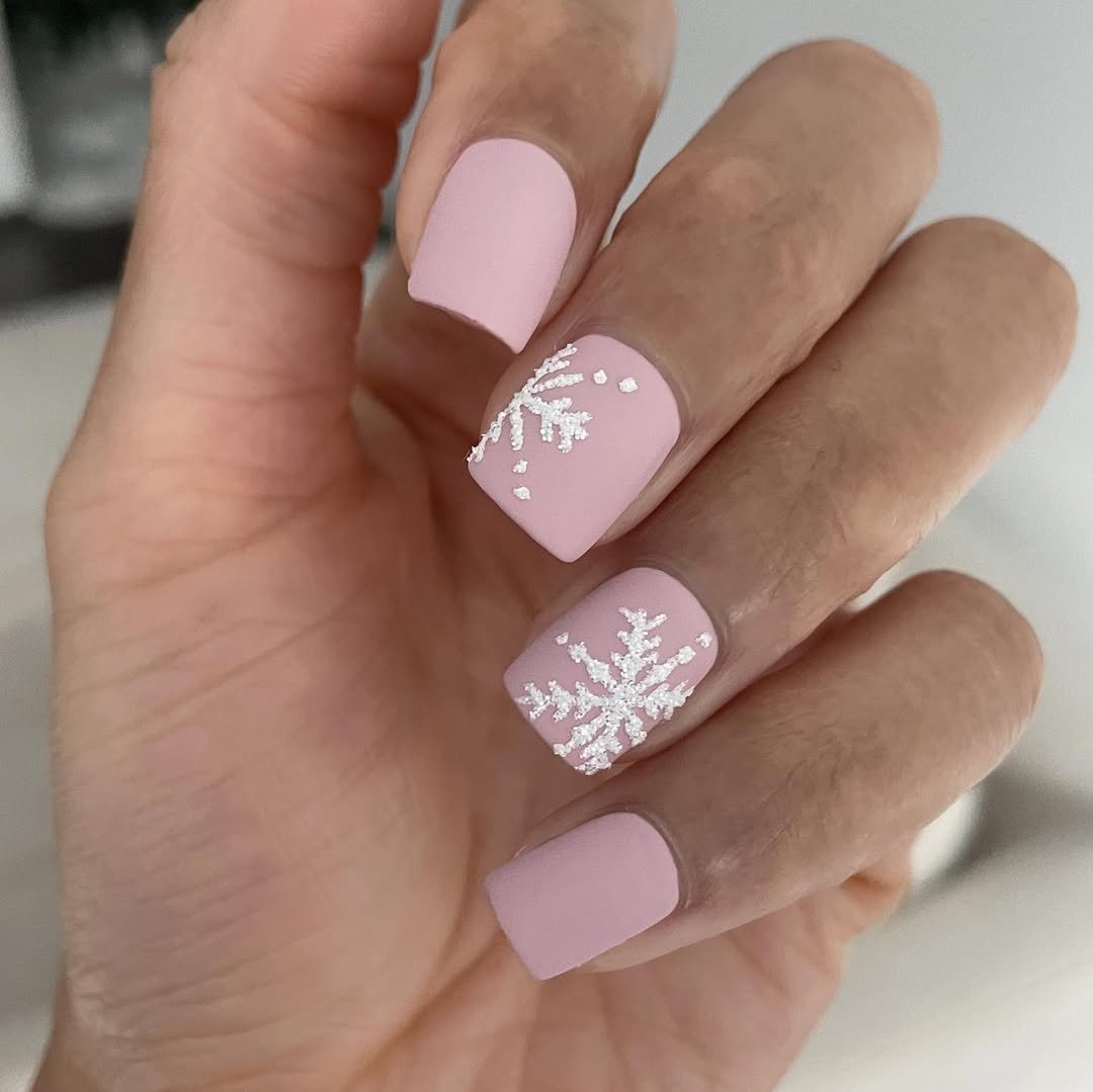 @ gabbysnailart nails the minimalist winter aesthetic with this frosted blush pink set. The matte finish gives it that cozy, velvety texture — like wrapping your hands around a mug of hot cocoa. The delicate white snowflake art adds a dusting of festive charm without going overboard.