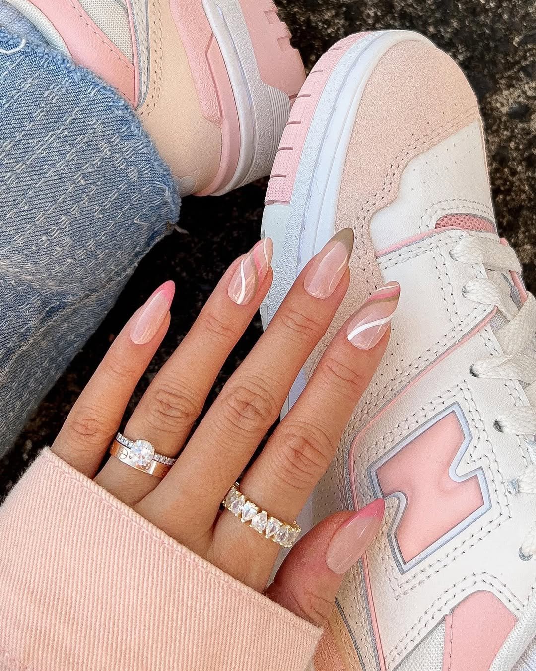 The translucent nude tones paired with milky pink and subtle shimmer make it feel effortlessly polished. It’s sporty, stylish, and a little romantic — kind of like the nail equivalent of your favorite blush-toned sneakers.