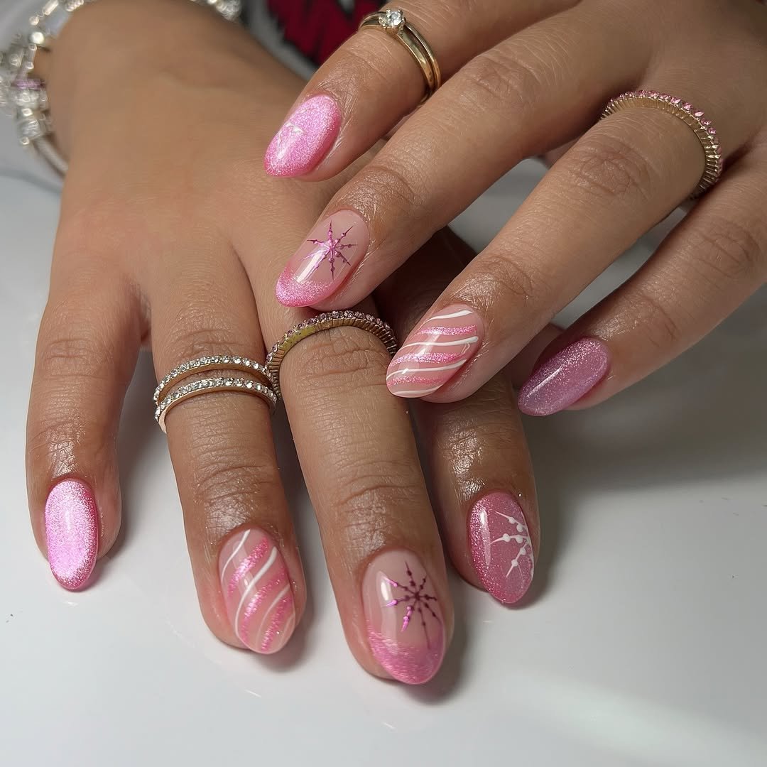 @nailsxmina brings serious holiday cheer with this pink frosted mix — think candy canes, shimmer, and just the right dose of sparkle. Each nail feels like its own little dessert, complete with stripes, snowflakes, and gradients that catch the light beautifully.